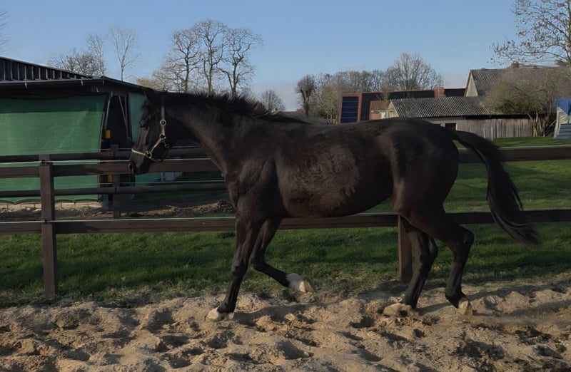 For sale on behalf of the owner: a 2-year-old Hanoverian gelding. He is very affectionate and loves to be cuddled and groomed; he is truly a sweetheart in handling and is always very interested in new things. He stands calmly for grooming, tacking up, and hoof care. He is vaccinated, dewormed, and has had his teeth checked. Currently, he stays in a box at night and is turned out in a paddock with an open stall during the day. His hooves will be trimmed again soon. He is sired by Fanegro / Dancier and was born on March 3, 2024. He is a dark bay (rapp) with four white socks and will grow to approximately 16.1 hh. He will undoubtedly make a wonderful leisure partner. Please note, he is being offered at a reduced price due to a minor cosmetic flaw (parrot mouth). Current photos are available.