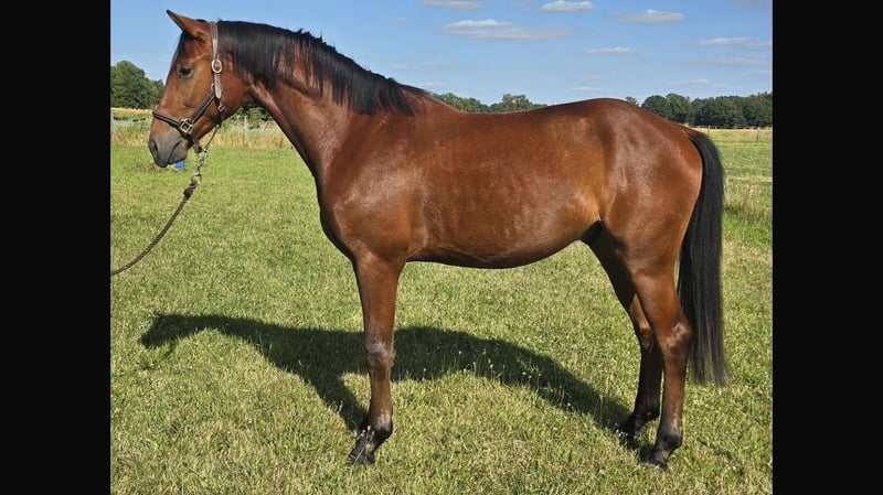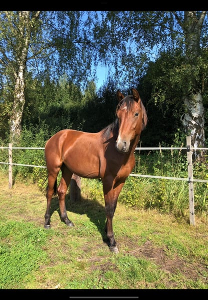Dreijähriger brauner Hannoveraner Wallach von Fusionist / Quaterhall / Davignon I aktuell noch roh. Das derzeitige Stockmaß beträgt 165cm. Mit einem halben Jahr ist er in einen renommierten Aufzuchtstall umgesiedelt worden, in dem er regelmäßig geimpft, entwurmt und dem Schmied vorgestellt worden ist. „Ferdinand“ kennt alle normalen Tagesabläufe wie rein und raus bringen, auf der Weide aufhalftern sowie den Schmied und ist dem Menschen gerne zugewandt. Er ist leicht am Halfter anlongiert und lässt sich gut alleine von der Herde wegführen ohne zu kleben. Der Wallach steht eher in leichten Typ, hervorzuheben sind seine drei guten Grundgangarten insbesondere der sehr gute Schritt und Galopp. Im Moment steht er mit zwei Stuten und zwei Wallachen zusammen und zeigt sich sehr sozial und ruhig. Im Sommer 24 Stunden Weide, im Winter nachts in der Box. Barhufer zur Zeit 24/7 auf der Weide. Eine liebevolle, gerne fördernde Endstelle wäre wünschenswert für ihn, ein Verkaufsstall ist keine Option.
