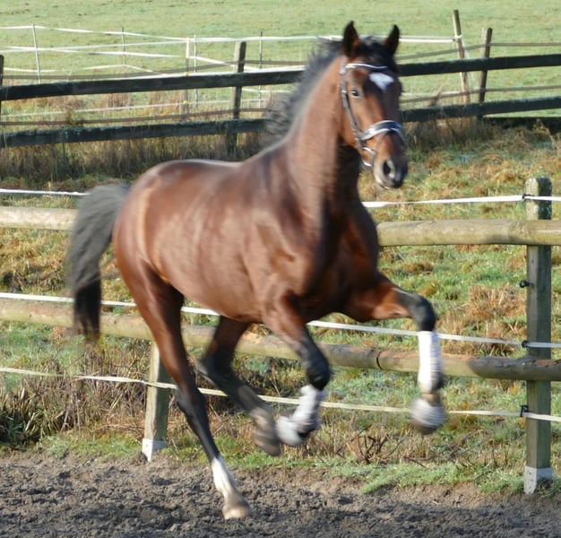 From a top breeding farm, half-brother to Vivino and two other licensed stallions, two half-siblings successful in Grand Prix competitions, good X-ray results available, including the back. A performance-oriented gelding with an excellent temperament, previously only lunged, will be saddle trained soon. A 4-year-old full brother achieved an 8.0 in dressage test class A (2nd place) and an 8.2 in riding horse class (3rd place) this year and is no longer for sale.