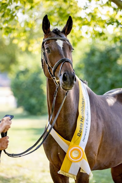Vierjarige Hannoveraanse ruin uit onze fokkerij met uitstekende afstamming: BAILADORINHO CE (Bert) Vader: BAILADOR (Benicio x Florencio I) Moeder: Hannoveraanse Prämienstute IXXI CE (IL DIVO x DON FREDERICO x WELTMEYER), BESTE HALF BLOOD merrie 2020 op de Herwart von der Decken-show, ook met zeer goede SLP Geboortedatum: 12 mei 2022 Maat: 1,68 m Opmerking: Röntgen TÜV inclusief hals en rug beschikbaar. Berti is in professionele opfok grootgebracht met diervriendelijke verzorging, is regelmatig gevaccineerd, ontwormd en voorgesteld aan de hoefsmid. Hij is zeer mensgericht en klaar voor een leeftijdsadequate opleiding. Omdat hij nog in de opfok staat, is er helaas geen recent, representatief filmpje dat recht doet aan zijn kwaliteit.