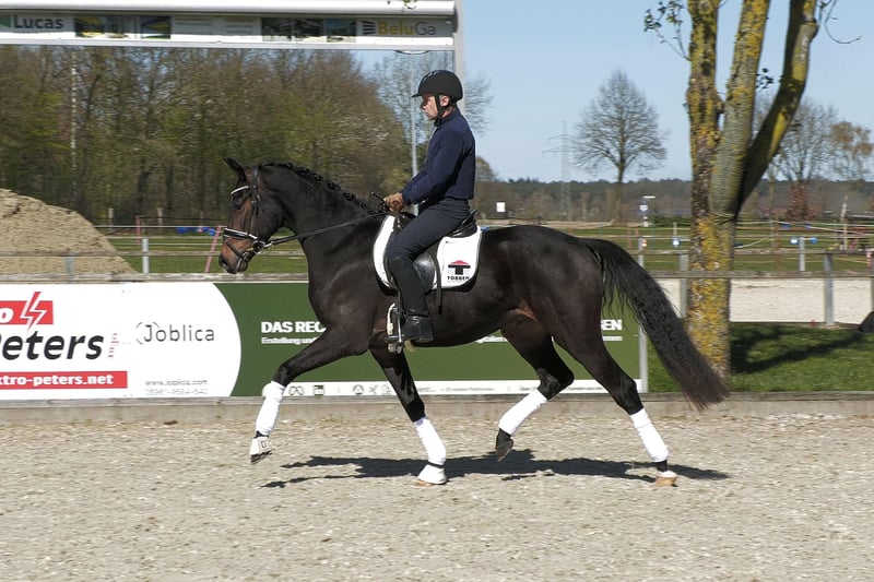Außergewöhnliches Nachwuchspferd mit drei (!) sehr guten Grundgangarten, hervorragender Rittigkeit und toller Arbeitseinstellung. Absolut unkompliziert im Umgang und beim Reiten, nicht guckig, wunderbar temperiert, d.h. nicht faul, aber auch nicht über empfindlich. Das Pferd ist gut angeritten und kann sicher drinnen und draußen geritten werden. Unheimlich liebes, ehrliches Pferd, das jeden Tag Freude macht.