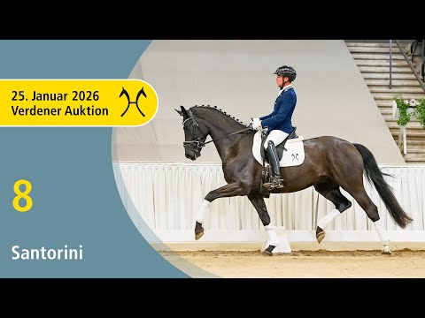 Als einer der Sterne der Kollektion präsentieren wir Ihnen Santorini. Bewegungsgüte, Leistungsbereitschaft und hervorragende Grundgangarten kommen hier zusammen. Seine Halbbrüder sind die gekörten Hengste Vitalio VIP und Valdisere v. Vivaldi und seine Großmutter stellt sechs im Dressursport erfolgreich S-Nachkommen, u. a. Dancing Star v. Dancing World (DRE: S siegreich mit Ann-Christin Wienkamp). Das Pferd wird abweichend von den Auktionsbedingungen mit einem eingeschränkten Versicherungsschutz verkauft. Bitte erkundigen Sie sich bei der Auktionstierärztin. 1. Generation gekörte Hengste: gek. Hengst Vitalio VIP v. Vivaldi (Adelheidsdorf 2023); gek. Hengst Valdisere/v. Vitalis v. Vitalis (Verden 2019,HM 2019). 2. Generation Sportpferde Dressur: Dancing Star 11 v. Dancing World (DRE: int. S** mit Ann-Christin Wienkamp); gek. Hengst Don Monet v. Don Nobless (DRE: M* mit Sophie Ludewig,Bundeschampionat f. Reitpferde 2015,Finalteilnehmer Bundeschampionat 4j.Reitpferde 2015,Championat f. Reitpferde 2015,Verden 2015). Aufbauprüfungen Dressur: Vicky in Love v. Valdiviani (DRE: L). Bes. Prämientöchter: HannPrA In My Dream v. In My Mind; HannPrA Dancing Beauty K./Dancing Beauty K v. Dancing World. 3. Generation Aufbauprüfungen Dressur: HannPrA Frieda RJO v. Floris Prince (DRE: L); HannPr Dornröschen/Dornröschen 170 v. Dancier (DRE: L). Auktionspferde: StPrA Dornröschen/Dornröschen 149 v. Dancier (VA 2012,Herwart von der Decken-Schau Verden 2011). Bes. Prämientöchter: HannPrA Queen/Queen 160 v. Quaterhall; StPr Romy v. Rascalino (Herwart von der Decken-Schau Verden 2010). 4. Generation Sportpferde Dressur: Waldzauber 11 v. Waikiki (DRE: Grand Prix mit Larissa Eßmann,Dressurprüfung Kl.S*** mit Piaffe und Passage 2019). Aufbauprüfungen Dressur: Falco Filou v. Floris Prince (DRE: L). Auktionspferde: Waldfee II LH/Waldfee II v. Waikiki (FoVA 2004). Bes. Prämientöchter: StPr Waldfee/Waldfee 647 v. Waikiki (Louis Wiegels-Schau Uelzen 2003). 5. Generation Sportpferde Springen: Esprit 126 v. Eiger I (SPR: M mit Kempf,Hans-Peter). Aufbauprüfungen Dressur: Experte 20 v. Eiger I (DRE: M mit Poetter,Bertin). Auktionspferde: Wunderfull v. Walt Disney II (VA 1998); Eigenlob/Eigenlob v. Eiger I (FoVA 1984). Mutter: Die Schöne Prämierung: 1xIa. ZL: 11/9 Großmutter: Romantica ZL: 14/13 Das Pferd ist ein Verdener Auktionspferd und wird am 25.01.2026 online versteigert. Vom 12.01. bis zum 25.01. kann das Pferd jeden Tag beim öffentlichen Training besichtigt und ausprobiert werden. Das Startgebot bei der Versteigerung ist 8.000 Euro.