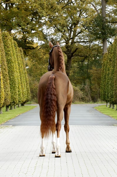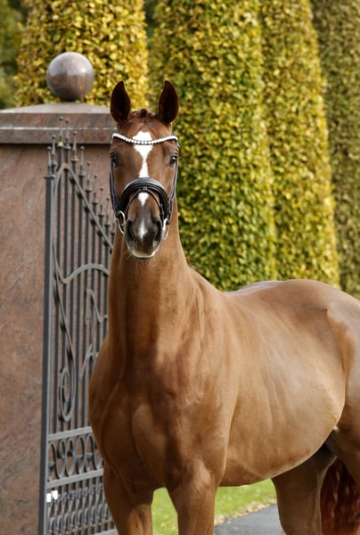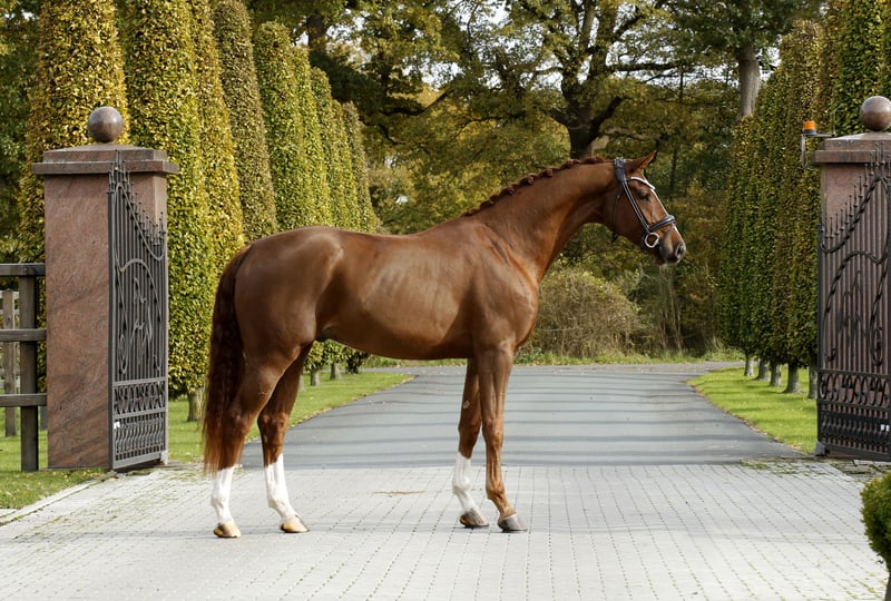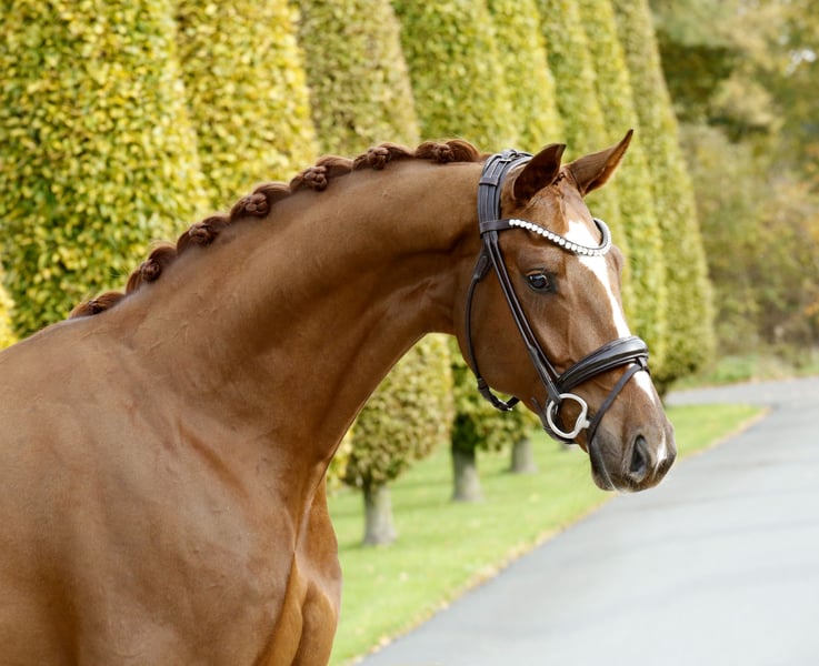 Highly modern young horse with a stunning, colorful chestnut coat and harmonious conformation. Equally well-bred with excellent quality, suitable temperament, and a strong, encouraging drive. Well-socialized, healthy, and raised in an appropriate manner, gently and sensitively backed. An exceptionally promising dressage athlete for ambitious riders and those seeking a standout performer. With a current, good TÜV – directly from the breeder.