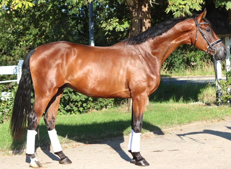 Typvoller 3 jähriger Wallach von Sezuan x Fürst Belissaro mit 3 sehr guten Grundgangarten, der alle Möglichkeiten für das große Viereck mitbringt. Er ist brav im Umgang jedoch noch nicht angeritten. Preis zzgl. Mwst. Anfragen nur telefonisch, E-mails werden nicht beantwortet.