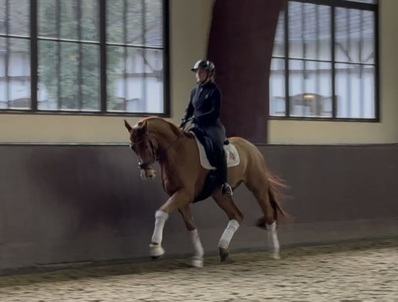 4-jähriger, ca. 178 großer, fuchsfarbener Hannoveraner Wallach von Destacado FRH aus einer Fürst Nymphenburg Mutter. Dolcetto beeindruckt auf Anhieb. Im Umgang sehr kopfklar und unkompliziert, unerschrocken und dem Menschen zugewandt, beigeistert er unter dem Sattel durch Ehrgeiz, Bewegungsfreude und genügend Sensibilität für das große Viereck. Er ist Arbeitswillig und beeindruckt mit drei sehr guten Grundgangarten. Er begeistert mit Bergauftendenz, Schulterfreiheit, großen Hebeln, Raumgriff, Schub aus einer gut gewinkelten, aktiven Hinterhand und einer feinen Anlehnung. Ein Ausbildungspferd für höchste Ansprüche! Bestens geeignet für kommende Championate und zur weiteren Ausbildung in den Grand Prix Sport! Weitere Infos gern unter 0152 04371144