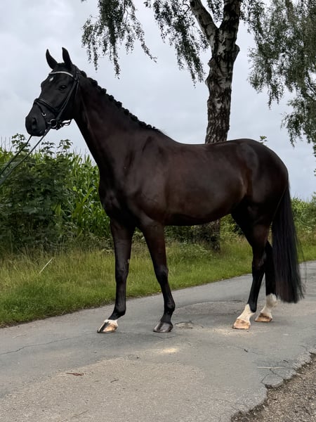 For Sale: Hanoverian Gelding A stunning Hanoverian gelding born in 2021 is available. Standing approximately 16.2 hh, he is the perfect partner for dressage enthusiasts. **Features:** - Breed: Hanoverian - Gender: Gelding - Year of Birth: 2021 - Color: Black (Rappe) - Height: 16.2 hh - Suitability: Dressage This talented gelding impresses not only with his expressive appearance but also with his excellent movements and willingness to learn. He is well-mannered, easy to handle, and ready for the next steps in his training. Additionally, he demonstrates a very good obedience jump under saddle, although this has not yet been fully developed. If you are interested or require further information, please do not hesitate to contact me. Don’t miss this opportunity!