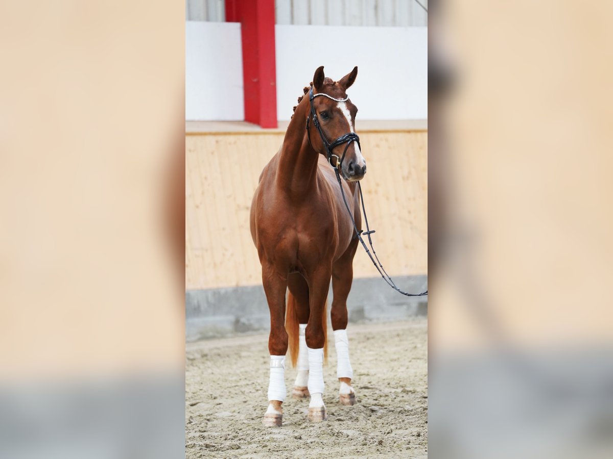 Promising Young Prospect for Dressage Sport For sale is a 4-year-old chestnut gelding with excellent basic prerequisites for dressage. He impresses with three very good basic gaits, particularly noteworthy are his uphill canter and an expressive, rhythmical walk. In daily handling, he is absolutely uncomplicated, friendly, and reliable. He loads without any issues, even alone, is well-behaved with the farrier, and is always pleasant to handle – even at competitions. A horse that leaves nothing to be desired in terms of character. He can also be easily managed by less experienced riders and is suitable as a transition horse. Under saddle, he works with great willingness to learn and always shows himself to be rideable and cooperative. He is currently placed in dressage horse A and impresses both at competitions and in training with his positive work ethic and pleasant riding feeling. 0172/4336587 Information without guarantee Price plus VAT On Instagram Frederike_ni