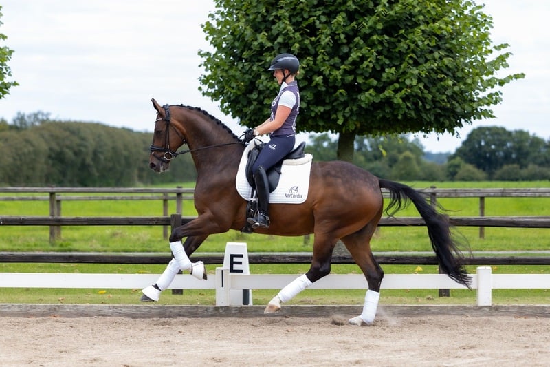 Denton ist ein 5-jähriger Wallach mit drei qualitativ hochwertigen Gangarten und einer ausgezeichneten Arbeitseinstellung. Er ist leicht zu handhaben, lernwillig und zeigt eine großartige Rittigkeit sowohl im täglichen Training als auch beim Erlernen neuer Übungen. Trotz seines jungen Alters arbeitet Denton bereits selbstbewusst an fliegenden Wechseln und Übungen für die 6-jährigen Klassen. Er hat auch mit versammelter Arbeit begonnen, einschließlich erster Schritte in Richtung Piaffe, und zeigt dabei Balance, Talent und Konzentration. Mit seinem soliden Fundament und seinem natürlichen Können ist Denton ein vielversprechender Kandidat für einen Reiter, der ein Top-Sportpferd für die Zukunft entwickeln möchte.