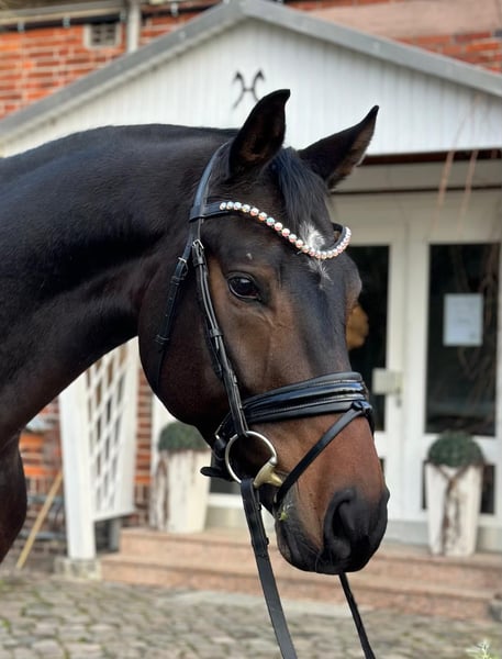 Damian ist bei uns auf dem Hof 2020 geboren. Er stammt aus dem ersten Jahrgang des Dressurpferdemachers Despacito. Der kleine Mann hat uns sofort so sehr begeistert das wir seine Mutter gleich wieder mit Despacito belegten. Wir haben ihm Zeit gegeben sich körperlich zu entwickeln. Erst vierjährig im Juni 2024 haben wir Damian in Ausbildung gegeben. Von Anfang an machte er beim longieren und auch in den ersten Minuten unterm Sattel viel Freude. Er will immer alles richtig machen. Aktuell ist der Ausbildungsstand bereits Dressurpferde L und wir beginnen spielerisch mit den ersten M Lektionen. Wir reiten viel im Freien und auch im Wald geht es sehr gut. Er muss und will immer gerne mal etwas neues sehen. Auch am Sprung stellt er sich nicht dumm an. Damian gibt seiner Reiterin ein tolles Gefühl durch schon sehr gute Anlehnung und Unerschrockenheit. Ein feiner Youngster der zu gefallen weiß.