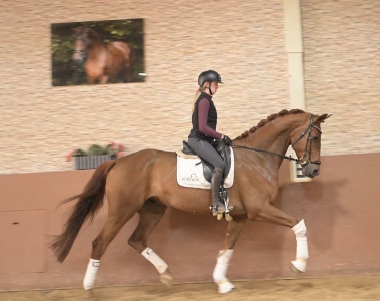 Dear Interested Parties, To arrange a test ride, please send me a WhatsApp message. For further questions, I am available during the day via WhatsApp, and you can reach me best by phone between 4 pm and 7 pm. I look forward to hearing from you. www.angelina-devittorio.de ⭐️Valerijo⭐️ Age: 5 years (2021) Height: approximately 17.8 hh Lineage: Vaderland x Laudabillis Training Level: Multiple winner and placings in Dressage Horse A Health: Good X-rays available; due to a slight respiratory noise (inspiratory sound), he is being sold at a significantly reduced price. He has no issues related to this. Location: 87700 Memmingen For sale is a tall, handsome chestnut gelding, sired by the proven Vaderland. This five-year-old young star impresses with his quality, presence, and three very good basic gaits. He has already demonstrated his talent successfully, placing multiple times and winning in Dressage Horse class A competitions. At shows, he was very straightforward and well-behaved. Growing up, he was given the necessary time to develop, so he is trained appropriately for his age and horse development, currently at the Dressage Horse A level. Despite his size, he is very pleasant to ride under saddle, always motivated and eager to please his rider. He has a very lovable, well-behaved, and balanced character. In daily handling, the gelding is extremely uncomplicated, reliable, and friendly. Due to his size, he is not suitable for complete beginners or inexperienced riders but is excellent for ambitious amateurs at solid A- to L-levels who are looking for a high-quality young horse with potential. An honest, handsome, and talented dressage horse with excellent conformation and a promising future.