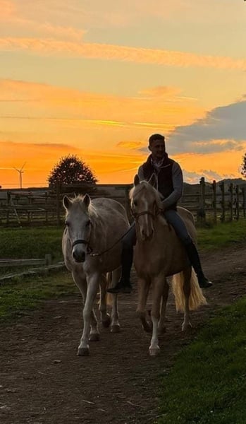 Golden Moon, also known as Keni, is a truly well-behaved, consistently reliable, and always motivated pony. He is exceptionally friendly both in handling and under saddle and always eager to please. He is characterized by three solid, absolutely rhythmical gaits. Farrier, loading, clipping, veterinarian visits, and washing are all no problem for him. He gets along very well with mares or geldings, whether in the pasture or on the paddock. He loves being around people, children, and dogs, and is always in good spirits. Only cold weather does not suit him ;-) He has a very good TüV, including neck and back. For inquiries, please feel free to call 0163 7883226 or send a WhatsApp message.