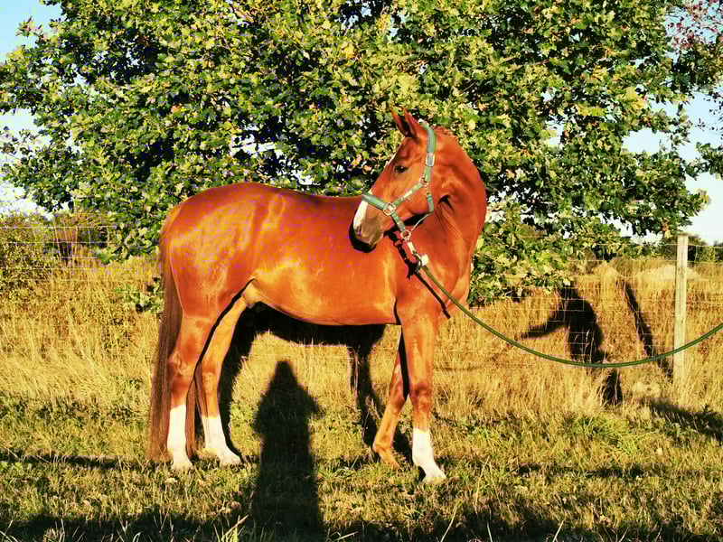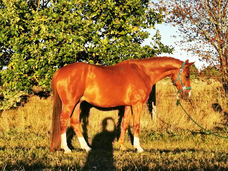 This 6-year-old Hanoverian is a beautiful colorful dark chestnut gelding with a height of approximately 1.67 m by Destano - Desperados x Don Frederico - Rubinstein I. He impresses not only with his finest dressage bloodlines but also with his great work ethic: the video with the white saddle pad was taken after a 3-week break. He is simply fun to ride! The second video was taken when he was 5 years old after 4 weeks of training; he was given time for physical development beforehand. With a lively, rhythmic movement and lightness in the hand, he was worked at a solid A-level last year and is now starting his very first L-level exercises. Due to his lineage, he finds balance and self-carriage easy. He has enough enthusiasm but is by no means too spirited in the arena and responds excellently to voice and breathing cues. As part of his initial training, he has jumped a small E-course. During the horse handler license training, he patiently practiced groundwork with children; he is also familiar with bridges and tarps. He works without side reins (also on the lunge) with children and less experienced riders in the arena and indoor riding hall - here, Olaf easily forgives mistakes. He adapts to the rider's level in the arena. He is familiar with trail rides alone and in groups under experienced riders at A-level, as he still needs security from above on unfamiliar routes due to his age. Olaf is very traffic-safe (including large agricultural machinery) and also goes through water. He is, of course, familiar with strange places and indoor arenas. He has not yet been presented at competitions. Absolutely gentle when being sprayed, washed, with the veterinarian, farrier, loading, and in daily handling. He is barefoot. He knows open stabling and paddock boxes. Olaf would certainly be very suitable for an ambitious leisure rider with a focus on dressage, as a family horse for experienced individuals, or for good riding schools.