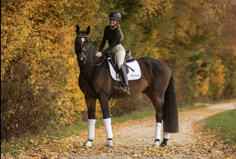 Ausdruck, Qualität & Charakter – 6-jähriger Dressurnachwuchs mit besonderer Perspektive Zum Verkauf steht ein typvoller, dunkelbrauner 6-jähriger Wallach (ca. 1,71 m) v. Finest – Sandro Hit aus privater Zucht. Er vereint moderne Bewegungsqualität mit einem außergewöhnlich ehrlichen, goldenen Charakter. Drei sehr gute Grundgangarten mit klarer Bergauftendenz zeichnen ihn aus – besonders hervorzuheben ist sein kraftvoller, elastischer Galopp mit viel Aufwärtstendenz und natürlicher Hankenbeugung. Er bringt damit beste Voraussetzungen für eine weiterführende sportliche Ausbildung mit. Er ist altersgerecht ausgebildet und steht auf einer soliden, durchlässigen Basis. Die weiterführenden Lektionen sind erarbeitet und geben einen klaren Ausblick auf sein Potenzial. Unter dem Sattel zeigt er sich sensibel, fein und mit gutem Vorwärtsdenken. Er reagiert schnell und möchte korrekt und ausbalanciert geritten werden. Daher sehen wir ihn nicht als Anfängerpferd, sondern idealerweise bei einer ambitionierten Nachwuchsreiterin (z. B. U25) oder einem fördernden Amateur mit sicherer Hand, der Freude daran hat, Qualität weiterzuentwickeln. Im täglichen Umgang ist er ein absoluter Schatz: menschenbezogen, freundlich und unkompliziert. Als selbstgezogener Wallach liegt er uns besonders am Herzen, weshalb wir für ihn ein langfristiges 5-Sterne-Zuhause suchen. Er wurde schonend aufgebaut, war bisher verletzungsfrei. Ein aktueller TÜV ohne Befund liegt vor. Preisvorstellung: 32.000 € Nur in wertschätzende, fördernde Hände.