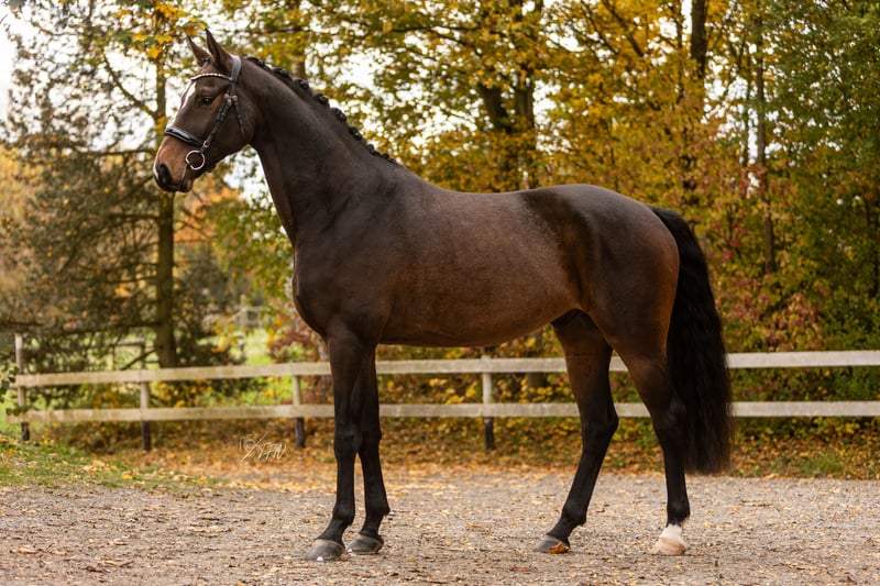 For sale from private owner 5-year-old Hanoverian gelding – Finest x Sandro Hit / Rubinstein I 16.1 hh | dark bay | Youngster with heart and presence. This handsome, expressive dressage prospect is looking for a sensitive rider who enjoys calmly and thoughtfully developing a talented horse. He has three above-average basic gaits, presents himself with a modern, typy exterior – noble, harmonious, and full of presence. In everyday handling, he is very people-oriented, affectionate, and friendly. Loading? ✅ Farrier? ✅ Handling? A treasure. 🤍 Under saddle, he is sensitive, rideable, and eager to perform – he listens very carefully and reacts finely. He requires someone who can sit quietly and give clear aids. Not suitable for beginners – but a real gem for the ambitious amateur or up-and-coming professional. X-ray images are available. Trial rides only for experienced riders with trainer accompaniment – out of fairness to him. 💛