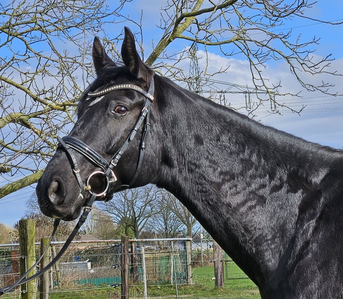 Prince Fineo "Neo" is a 172 cm tall Hanoverian gelding by Fürst Belissaro, Fürstenball, Fürst Heinrich/Florencio I, Florestan I. He is being sold by private owners with a heavy heart. Neo will turn 7 years old at the end of April and is still developing. He is unlikely to grow much taller but will continue to develop a good build. Neo has been well-trained by his owner. He competes at an A-level in dressage. He has not participated in competitions yet, as his owner had no ambitions in that direction. Additionally, Neo is familiar with pole work, and with further training, he will likely enjoy jumping as well. Neo has always been out in the field, whether in a group or alone. He has always been fearless and confident outdoors. Neo has three solid, good gaits, is a pleasure to ride, and you can rely on him 100%. He is also a sweetheart in handling—an uncomplicated and well-mannered horse. :-) Neo has been healthy so far. When purchased 3.5 years ago, his owner had a comprehensive pre-purchase exam including all X-rays done, all of which showed no findings. Moreover, Neo is compatible with all other horses. He is sold with accessories. For more information, we look forward to your calls at: 0177/2721831. If you are interested in videos, please contact us directly via WhatsApp!