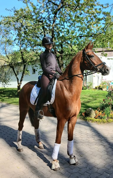 Tai is a very charming and friendly young horse. Bloodlines and very elegant. Gently backed and directly from the breeder, all doors are open to him. He is very comfortable and soft in the hand, always has a good forward movement, and is eager to work. He is also very easy to sit. We see him as a lovely horse for transitioning or for ladies. Since he is a bit more delicate and smaller, he was backed at the end of his fourth year. He has not yet been exposed to competition atmosphere. He enjoys hacking out, preferably in company. A very recent health certificate is available! Absolutely herd-proof. No prior health issues. Please call or message directly at 0172 8694703.