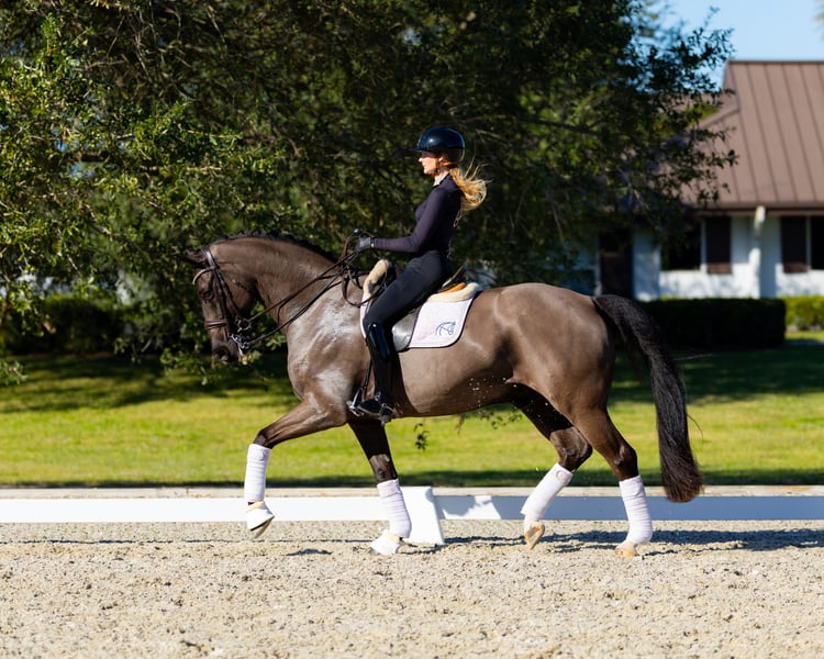 This black, unpolished diamond is by the world-renowned stallion Glamourdale, known for producing modern dressage horses with stunning gaits, excellent rideability, and strong competitive instincts. Gentleman embodies his pedigree, with energetic impulsion, perfect balance, and a positive, willing attitude - his walk and canter are exceptional. He has already successfully competed in 4-year-old classes in 2025, showcasing his talent. If you are looking for a young horse with a bright and promising future, Gentleman is the one for you!