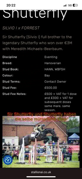 Verkaufe elegante Stute mit Top Springpapier – aus der Shutterfly-Linie! Fliegenschimmel, Geburtsjahr 2016 Diese wunderschöne Stute besticht durch ihre ansprechende Erscheinung und ihre hervorragende Abstammung. Geboren im Jahr 2016, ist sie eine vielversprechende Zuchtstute mit viel Potenzial. Mit einem Stockmaß von 165 cm vereint sie Eleganz und Stärke. Sie hatte 2022 ein Fohlen und wurde im Anschluss nicht wieder auftrainiert. Aktuell hat sie hinten lockere Bänder und wird daher als Zuchtstute abgegeben. Ideal für Zuchtinteressierte die Wert auf Qualität legen. Die Abstammung ist in den Bildern ersichtlich. Bei Interesse oder weiteren Fragen stehe ich Ihnen gerne zur Verfügung.