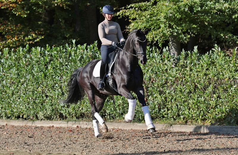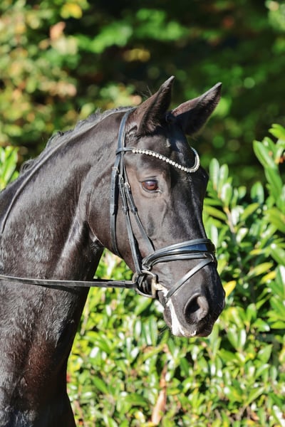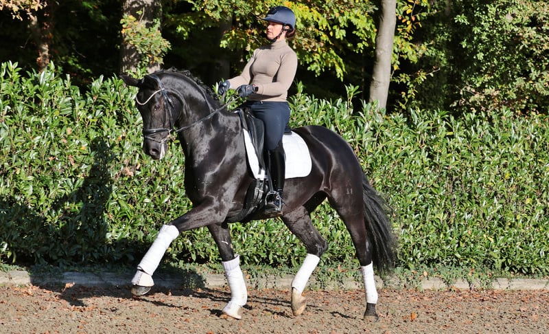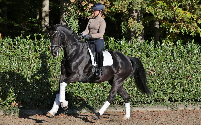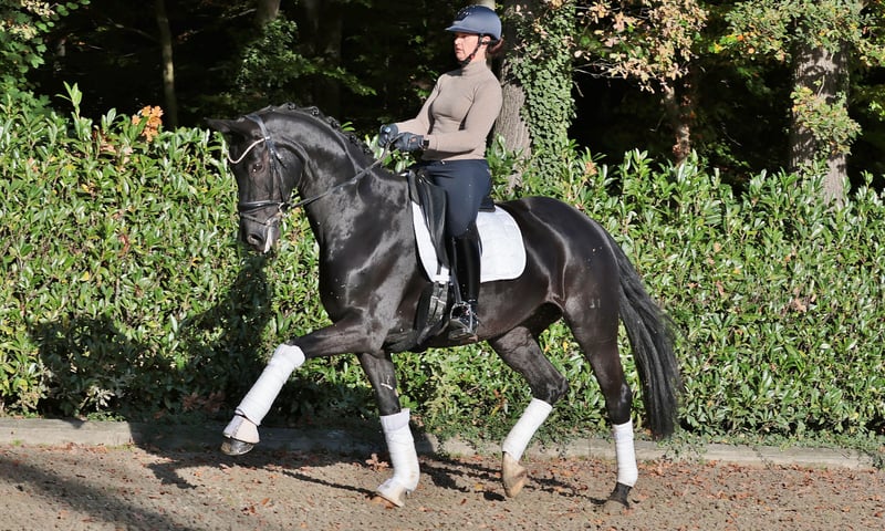 Schicke 10 jährige Hannoveraner Stute. Lackschwarz, ca. 1.70m groß. Seit fünfjährig ausschließlich von Amateur ausgebildet und auf dem Turnier vorgestellt, konnte sie Siege und Platzierungen bis Kl. L mit nach Hause bringen. Ganz aktuell ist sie dreimal in Folge L hoch platziert. Sie befindet sich im Training auf einem sehr guten Weg in die Klasse M und bringt bei weiterem Training auch noch Entwicklungspotential mit. Ihre absolut liebevolle und unkomplizierte Art, machen sie sowohl für den Sport, als auch für der Freizeitreiter oder Junior interessant. Natürlich ist sie Schmiede- und Verladefromm und auch in fremder Umgebung jederzeit brav und gut händelbar. Gute Röntgenbilder liegen vor, ein aktueller klinischer Ankauf war ebenfalls ohne Befund.