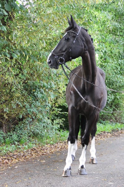 This jet-black beauty with four white legs and a distinctive blaze is not only a visual stunner – her presence attracts all eyes. However, her true strength lies in her calm, clear nature: She impresses with her reliability, her composure in every situation, and her open, fearless demeanor – even in unfamiliar surroundings, she always presents herself confidently and quickly finds her way. The 10-year-old mare (approximately 1.75 m) shows light contact under saddle, is fine to ride, and impresses with her exceptional swing, clear uphill tendency, and three expressive basic gaits. In dressage, she is trained to L level and shows great potential for further development. She requires correct riding and desires an experienced rider who can further promote her potential and work with her sensitively. She also happily takes on poles or small jumps, although she has not been specifically trained in this area so far. Her true talent clearly lies in dressage, where she excites with her expressiveness, rideability, and potential. On paper, she has everything: With her pedigree of Rotspon x Der Lord, she combines performance and rideability in an impressive way – a lineage that speaks for itself and underscores her quality. For this reason, she is also interesting for breeding. Whether in the arena, on the trails, or simply in daily handling – this mare brings joy. She is fearless, good for the farrier and loading, and presents herself as a true all-rounder who impresses daily with her positive work ethic. Due to changes in our personal circumstances, we are looking for a loving and suitable home for Roxy. For serious inquiries, we are happy to send videos of her being ridden as well as from her daily life. A trial ride is possible by arrangement (cost contribution of €20).