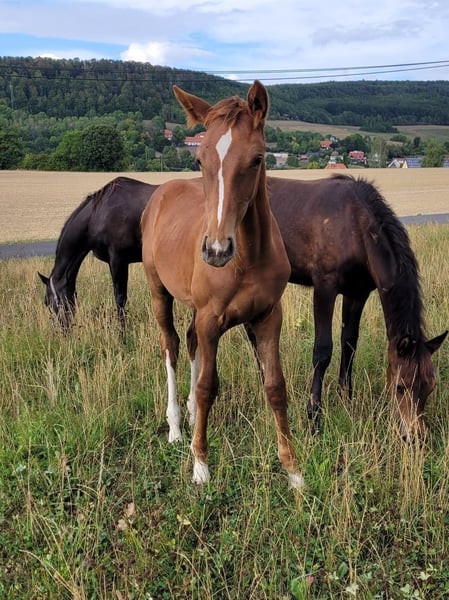 Sie brachte im Frühjahr 22 ein sehr hübsches Stutfohlen(s. Bilder) und erwies sich als sehr patente Mutterstute. Daher haben wir die Bedeckung wiederholt und sie hat am 22.2.23 erneut ein sehr schickes Stutfohlen von Diathletico gebracht das prämiert wurde. Beide Jungstuten können am Standort der Stute in Nordthüringen besichtigt werden.
