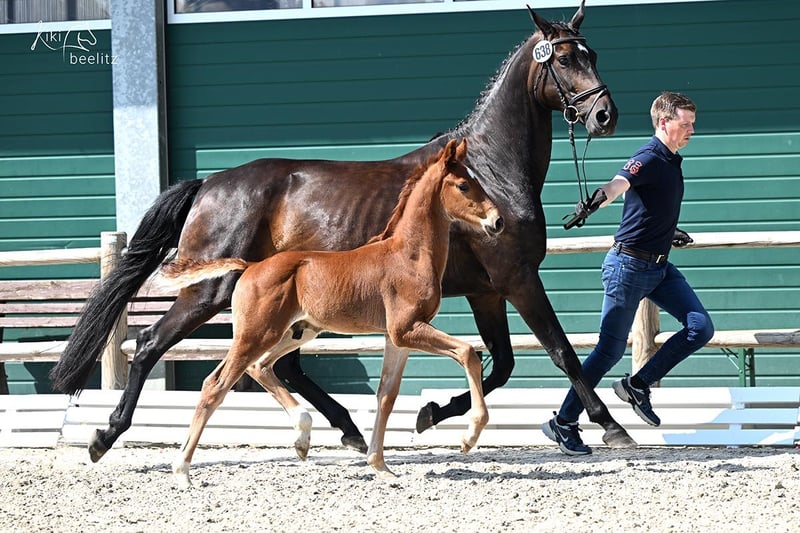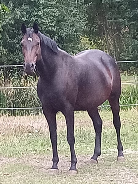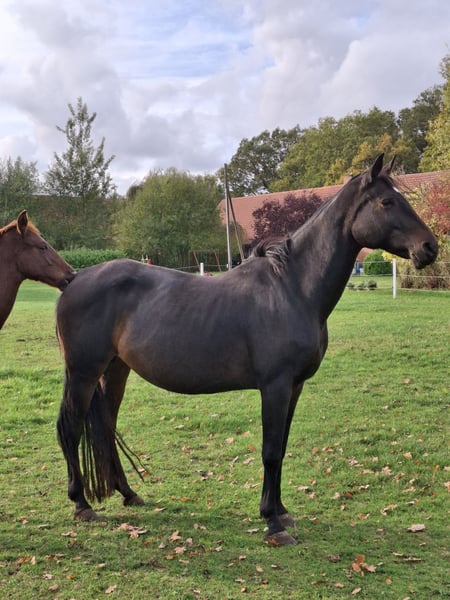 Beautiful broodmare/companion horse with an excellent pedigree by Finest/Fürst Romancier/Wolkentanz I, 11 years old, dark bay. Her dam was a two-time class winner. She is being sold only due to retirement from breeding and is priced well below value, as she is currently lame from an injury. She is not suitable for riding. She has had three wonderful foals so far; one foal was sold at auction to Spain. We are looking for a loving home. She is very gentle and also suitable as a companion horse. She is a caring mother, herd-friendly, and we ensure regular deworming and farrier visits. The mare can be viewed at our home. Phone: 0170/7818401