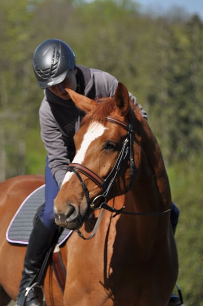 Our mare is honest, well-behaved, and easy to ride for most riders, but she is not suitable as a beginner's horse. Due to an issue with both front legs, she is limited in demanding dressage work or jumping training. She has been trained up to L-level dressage, and has achieved placements in A-Dressage. She has also been ridden up to A-level in jumping. She truly enjoys cross-country riding – whether alone or in a group, she remains calm and reliable. She also loves ground work. In handling, she is a truly trustworthy partner: very affectionate and human-oriented, she is uncomplicated when it comes to shoeing and loading, making daily handling easy. We are looking for a loving home for her with a family environment, where she can have plenty of turnout and be appreciated as a leisure and trail horse.