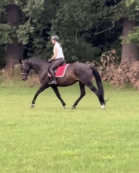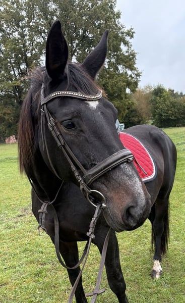 My beloved 17-year-old mare (Hofrath x De Niro) is looking for a lovely new home. She has had three wonderful foals so far (with her previous owner), the most recent in 2024, and since August, I have been riding her sporadically in the field or on the pasture, as well as lunging. She is well-behaved in handling, and the farrier is no problem. Under saddle, she still needs a bit more training; I have only worked on canter at the lunge so far. Her trot is lively and comfortable. Unfortunately, I lack the time for more intensive training, as I can only ride her irregularly—sometimes several times a week, but other times not for several weeks. She needs consistent work, especially after her foal rest, to get her properly forward and engaged. She is 1.73 meters tall. If everything fits, her companion (a 20-year-old gelding, limited riding ability) can also be rehomed together. Place before price, we look forward to getting to know you.