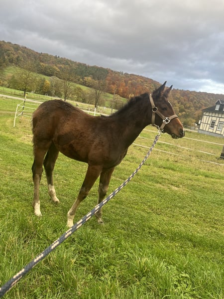 Zum Verkauf steht ein sehr typvolles und ausdrucksstarkes Hannoveraner Stutfohlen, das mit edlem Erscheinungsbild, korrektem Fundament und guten Grundgangarten überzeugt. Die Bewegungen sind elastisch, taktsicher und altersgemäß. Die Mutter stammt aus dem leistungsbewährten Stutenstamm der Germanin, der für Qualität, Rittigkeit und sportliche Erfolge bekannt ist. Mutterabstamung: Grace x Conteur (siehe Bilder) Der Vater ist unser eigener Hengst „Hugo“ (Trakhener/Zangersheide) von Hakira x Sun-Wil-BL` S Z Ein aufmerksamer, neugieriger, menschenbezogener Charakter gepaart mit guten Grundgangarten lassen bei dieser Maus keine Wünsche offen für eine Zukunft mit Perspektive sowohl im Springen als auch für die Dressur. Geboren am 03.08.2025 Wird voraussichtlich +/- 1,70m Regelmäßig Entwurmt Bei ernsthaften Interesse schicke ich gerne nähere Infos und aktuellere Bilder Bild mit Abstammungen ist die von der Mutter! Nicht vom Fohlen. Der Pass ist aktuell beim Hannoveraner Verband für eine Korretur und dürfte in kürze wieder zurück sein! Preis ist vhb, bzw. kann auch ein Preisangebot genannt werden, uns ist es wichtiger das sie in gute fördernde Hände kommt! :) wird nur aus privaten Gründen Verkauft!