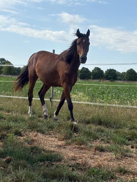 🐎 3j. Stute Cashmere x Uccello – top Mutterlinie 1,50m | Hunter & Springen Moderne, elegante Nachwuchsstute mit sehr guter Einstellung und viel Qualität für Sport und Hunter-Bereich. Aus der bewährten Mutterstute Violette, deren Nachkommen international bis 1,50 m unter Kent Farrington in Wellington International erfolgreich sind. • 3-jährig, roh • Sehr fein und sensibel • Gute Grundgangarten • Erwartetes Endmaß ca. 1,60 m Durch ihre Rittigkeit, ihre feine Art und ihre kompakte Größe auch sehr interessant für den Hunter-Bereich.