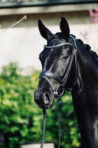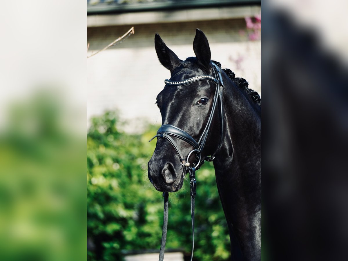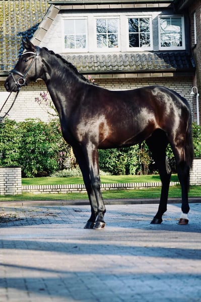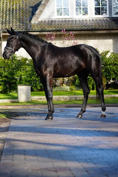 Very elegant, jet-black 3-year-old mare with a striking presence and a modern appearance. She impresses with excellent basic gaits, plenty of go, and a high level of willingness to perform. Spirited yet always honest, hardworking, and easy to handle in daily interactions. A modern, high-quality young horse with excellent potential for further training – ideal for ambitious riders seeking a talented young prospect with a strong work ethic.