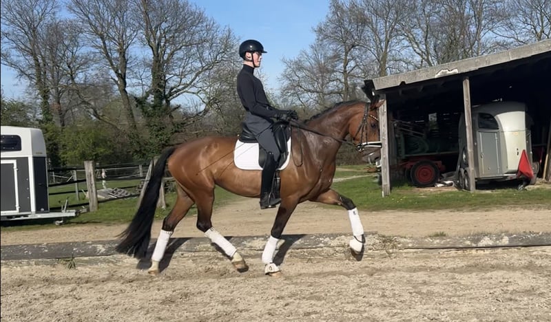 Cheval de dressage | Jument | 4 ans | environ 168–169 cm Donnerbube (Donnerhall) x Aromats Nous proposons à la vente une jument de dressage très attractive, âgée de 4 ans, avec une apparence moderne et une présentation globale convaincante. La jument se distingue particulièrement par sa très bonne aptitude au travail et son caractère équilibré et facile. Elle est absolument calme, non peureuse, et se montre fiable tant au quotidien qu’en selle. Sous la selle, elle se présente légère en main, agréable à monter, et dotée d’un équilibre naturel. Elle possède trois allures de base très bonnes : - Pas avec beaucoup de dépassement - Trot élastique et cadencé - Galop monté et bien équilibré Progressée selon son âge, prête pour le niveau Dressage A et déjà sur une voie sûre vers la classe L. En raison de son tempérament et de sa qualité, elle est intéressante aussi bien pour des amateurs ambitieux que pour la compétition. 🩺 Certificat vétérinaire actuel, y compris radiographies, sans anomalies 📍 Localisation : Neuss