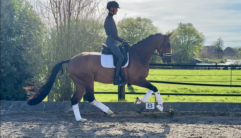 Dressage Horse | Mare | 4 Years Old | Approx. 16.1–16.2 hh Donnerbube (Donnerhall) x Aromats For sale is a very attractive 4-year-old dressage mare with a modern appearance and an impressive overall presence. The mare stands out especially for her excellent rideability and her balanced, uncomplicated temperament. She is absolutely well-behaved, not spooky, and consistently reliable both in daily handling and under saddle. Under the rider, she moves easily in hand, is comfortable to sit, and displays natural balance. She has three very good basic gaits: - Walk with plenty of overtrack - Elastic and expressive trot - Uphill and well-balanced canter Her training is age-appropriate, and she is ready for Dressage Horse Class A and already on a solid path toward L-level. Due to her temperament and quality, she is suitable for ambitious amateurs as well as for competitive riding. 🩺 Current health certificate including X-rays available without any findings 📍 Location: Neuss