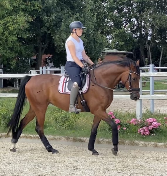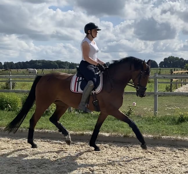 For sale is a four-year-old Hanoverian mare from our own breeding, bay, with a height of approximately 1.64 m. She is being sold due to our own offspring and thus a lack of time. Her pedigree is Benicio x Sir Donnerhall x Rohdiamant, which indicates potential for leisure, dressage, and possibly breeding. The mare is well started under saddle, is familiar with both indoor and outdoor arenas, and has a calm, friendly disposition, interacting well with people in her daily life. She is an ideal horse for girls, women, or amateurs. The mare remains calm and attentive even in challenging situations. Health-wise, she is regularly vaccinated, dewormed, and receives regular hoof care, as well as veterinary checks. Currently, she is shod in front. If you are interested or have further questions, please feel free to send a message. Viewing appointments and trial rides are possible by arrangement.
