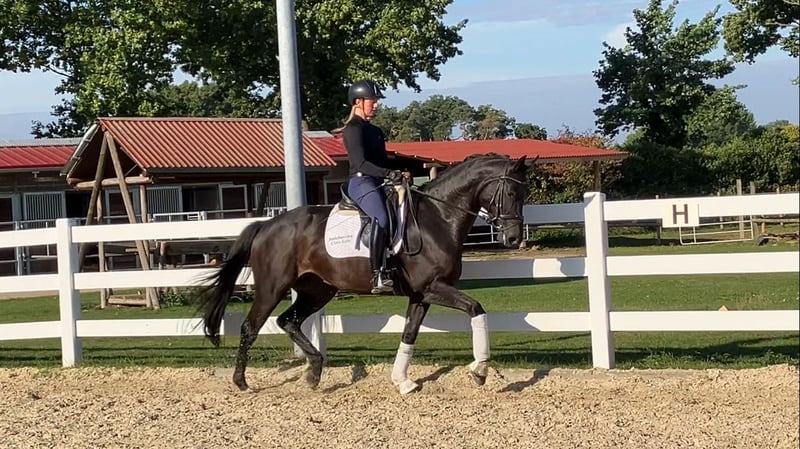 Elise is still owned by her breeder. Good X-rays + back are available. Elise was backed in autumn 2024 and has been successfully presented in dressage horse tests of class A this year. For her young age, she is already quite fearless and has no problems with new situations such as being transported, busy warm-up areas, or new environments. Her three good basic gaits combined with a comfortable basic swing leave no wishes unfulfilled for Elise as a young dressage horse.