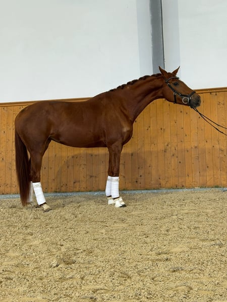 So Pretty is in consistent professional training. She works in all three gaits and is currently learning movements such as counter-canter, leg-yield, and simple changes. She is suitable for an experienced rider looking for a horse for the future. She is easy to handle during grooming, tacking, farrier visits, and veterinary care. The mare is regularly vaccinated, dewormed, and front-shod. She has no vices and is daily turnout on pasture. Recent high-quality X-rays are available for review. She holds a Hannoveraner Verband passport. She is from our breeding program, and we are full members of the association. The mare is stabled near Warsaw.