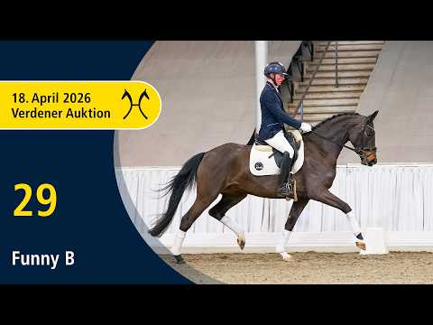 Das Pferd ist ein Verdener Auktionspferd und wird am 18.04.2026 onlive versteigert. Vom 6.04. bis zum 18.04. kann das Pferd jeden Tag beim öffentlichen Training besichtigt und ausprobiert werden. Das Startgebot bei der Versteigerung ist 8.000 Euro. Funny ist eine typstarke Dressurhoffnung für den ambitionierten Reiter. Ihr flüssiger Bewegungsablauf verspricht eine große Karriere. Vier Halbgeschwister sind bereits erfolgreich in Aufbauprüfungen und bestätigen die Qualität des Mutterstamms, der von Falada M (int. Grand Prix mit Karen Tebar), Final Countdown VIP (Grand Prix mit Ville Palomäki), Enrico de Hus FRH (M mit Jennifer Stein) und Walido R (S** mit Daniela Raindl) angeführt wird. 1. Generation Aufbauprüfungen Dressur: Dancing Diamond/Dancing Diamond 29 v. Rosengold (DRE: L). 3. Generation Sportpferde Dressur: Walido R 2 v. World Cup I (DRE: S** mit Daniela Raindl); Wonderful-Dream v. World Cup I (DRE: M mit Rubel,Stefanie). Aufbauprüfungen Gelände: Tiffany/Tiffany 119 v. Tannenberg (Gelände: L). Auktionspferde: Trust Me 4 v. Tannenberg (VA 1992). 4. Generation Sportpferde Dressur: gek. Hengst Grabow/GRABOW 2 v. Grande (DRE: S** mit HEESE,PETRA,Verden 1977); Bachmann v. Batum (DRE: M* mit Cora Hegedüs). Sportpferde Springen: Ilexa/Ilexa 5 v. Ile de Bourbon (SPR: 1,30 m mit Alisa Löwenstrom); Gracia/Gracia 139 v. Graf Landau (SPR: M mit Peters,Timm); Williams 10 v. World Cup I (SPR: M mit Salzgeber,Franz); GRANDE 34 v. Grande (SPR: M mit STOECKER,GUENTER). gekörte Hengste: gek. Hengst Latango/Latango 3 v. Lanthan (Marbach/L. 1994). Bes. Prämientöchter: VbPr Gräfin v. Grande. 5. Generation Sportpferde Dressur: Djembé de Hus/Djembe de Hus OLD v. Damon Hill (DRE: int. Grand Prix mit Justin Verboomen,Grand Prix Kür -Weltcup- Qualifikation -international- 2026,Grand Prix -international- 2026,Grand Prix Special -international- 2025,Grand Prix -international- 2025,GPS - Grand Prix Special 2024,GP - Grand Prix 2024,Grand Prix Special -international- 2024,Dressurpferdeprüfung -international- WM 6 jährige Kl. M 2021); Falada II/Falada M v. Forrest (DRE: int. Grand Prix mit Karen Tebar,Grand Prix Special -international- 2008,Grand Prix -international- 2008,Dressurprüfung KI.S**** - Grand Prix Special - 2008,Dressurprüfung Kl.S**** - Grand Prix de Dressage 2008,Grand Prix Kür -international- 2008,Grand Prix Special -international- 2008,Grand Prix -international- 2008,Grand Prix Special -international- 2008,Grand Prix -international- 2008,Dressurprüfung Kl. S- Grand Prix Special - 2007,Dressurprüfung Kl. S- Grand Prix de Dressage 2007,Dressurprüfung Kl. S- Grand Prix Special - 2007,Grand Prix Special-international- 2006,Dressurprüfung Kl. S- Grand Prix Special - 2006,Grand Prix Special-international- 2006,Grand Prix Special-international- 2006,Grand Prix Kür-international- 2006,Grand Prix Special-international- 2006,Grand Prix -international- 2006,Dressurprüfung Kl. S- Grand Prix Special - 2006,Dressurprüfung Kl. S- Grand Prix de Dressage 2006,Grand Prix Special-international- 2006,Dressurprüfung Kl. S- Grand Prix Special - 2005,Dressurprüfung - Gr.Prix Kür Int. 2005,Dressurprüfung - Grand Prix Special 2005,Dressurprüfung - Grand Prix 2005,Dressurprüfung - Gr.Prix Kür Int. 2005,Dressurprüfung - Grand Prix 2005,Europameistersch.Dress.Sen-Einz.Gr.Pr.Kür 2005,Dressurprüfung - Grand Prix Special 2005,Dressurprüfung - Grand Prix 2005,Dressurprüfung - Grand Prix 2005,Grand Prix Special-international- 2005,Dressurprüfung - Grand Prix 2005,Dressurprüfung - Grand Prix 2004,Dressurprüfung - Grand Prix Special 2004,Dressurprüfung - Grand Prix 2004,Dressurprüfung - Grand Prix Special 2003,Dressurprüfung - Grand Prix 2003,Dressurprüfung - Grand Prix Special 2003,Dressurprüfung - Grand Prix 2003,Dressurprüfung - Grand Prix 2003); Rivaner 2 v. Rotspon (DRE: int. Grand Prix mit Daniel Göhlen,Dressurprüfung Kl. S*** - Grand Prix Kür - 2015,Dressurprüfung Kl. S*** - Grand Prix Kür - 2015,Dressurprüfung Kl. S*** - Grand Prix Kür - 2014,Dressurprüfung Kl.S*** mit Piaffe und Passage 2013,Dressurprüfung Kl.S*** mit Piaffe und Passage 2013,Dressurprüfung Kl.S*** mit Piaffe und Passage 2013,Dressurprüfung Kl.S*** mit Piaffe und Passage 2012,Dressurprüfung Kl.S*** mit Piaffe und Passage 2012,Dressurprüfung Kl.S*** mit Piaffe und Passage 2012,Dressurprüfung Kl. S*** - Grand Prix de Dressage 2012,Dressurprüfung Kl. S*** - Grand Prix de Dressage 2012,Dressurprüfung Kl. S*** - Grand Prix de Dressage 2011); VbPr Hera/Hera 111 v. Weltmeyer (DRE: Grand Prix mit Jill Jessica Mieleszko,Dressurprüfung Kl. S- Grand Prix Special - 2006,Dressurprüfung - Grand Prix 2005,Dressurprüfung - Grand Prix Special 2004,Dressurprüfung - Grand Prix 2004,Dressurprüfung - Grand Prix 2004,Dressurprüfung - Grand Prix Special 2004,Dressurprüfung - Grand Prix 2004,Dressurprüfung - Grand Prix 2004,Dressurprüfung - Grand Prix 2004,Dressurprüfung - Grand Prix Special 2003,Dressurprüfung - Grand Prix 2003,Dressurprüfung - Grand Prix 2003); Final Countdown VIP v. Fahrenheit (DRE: Grand Prix mit Ville Palomäki,Dressurprüfung Kl. S*** - Grand Prix Special - 2025,Dressurprüfung Kl. S*** - Grand Prix de Dressage 2025,Deutsche Amateur-Meisterschaft Dressur 2025); Faletto v. Forrest (DRE: Grand Prix mit Katharina Bethmann,Dressurprüfung Kl. S- Grand Prix de Dressage 2005,Dressurprüfung - Grand Prix 2003,Dressurprüfung - Grand Prix 2002); Hollister 5 v. Hochadel (DRE: S*** mit Danica Langenstein); Dr. Watson 8 v. Don Frederico (DRE: S** mit Anna-Lena Michalke); Loriot 347 v. Rubinstein I (DRE: S** mit Eva Schulte-Günne); Jacomo 38 v. Justinian (DRE: S** mit Christina Ott); Donegan/Donegan 2 v. Donnerhall (DRE: S** mit Werner Bergmann); Laurentius 5 v. Lauries Crusador (DRE: S** mit Dagmar, van Gemmern); Fabiola/Fabiola 189 v. Argentinus (DRE: S** mit Elke Kampmann); gek. Hengst Weltadel v. Welt As (DRE: S** mit Gallemann,Christian,Kreuth 1999); Pernambuco 2 v. Pilot (DRE: S** 