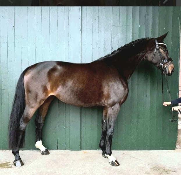 Elegant Hanoverian mare for sale – ideal for dressage! We are offering a beautiful dark bay Hanoverian mare, born in 2021. Standing at 16.1 hh, she has a compact and ideal size. She is well-suited for dressage and demonstrates great talent and willingness to learn. This talented young mare impresses with her elegant appearance, friendly demeanor, and promising movement. She has been carefully trained and is in good riding condition. If you are interested or have any questions, please feel free to contact me. Viewings and test rides can be arranged by appointment. Contact me for more information!