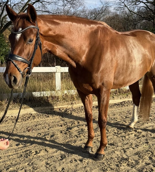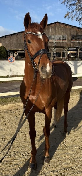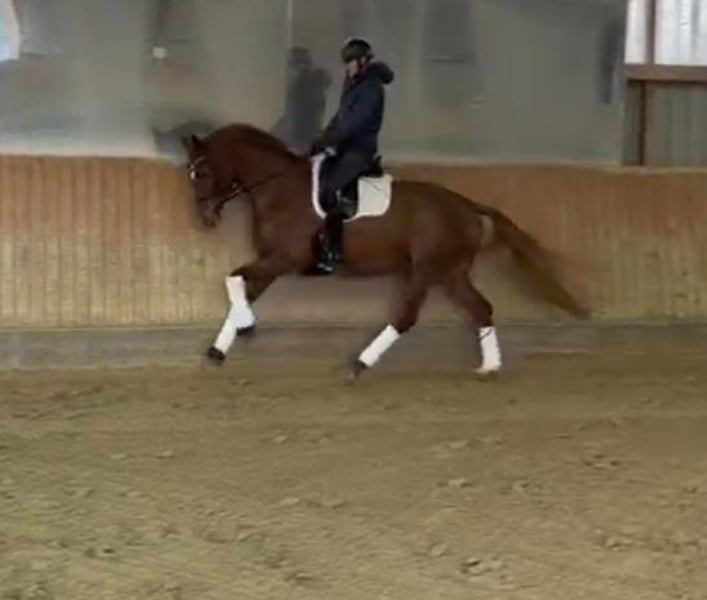 For sale is a stunning four-year-old chestnut mare by Von und zu x Lauries Crusador, exhibiting three very good basic gaits. Notably, her very expressive, elastic trot and her expansive canter stand out. In daily work, the mare consistently demonstrates her diligence, willingness to perform, and strong learning ability. She is beginning to show some collection and already performs very confidently in extended canter. Further information and videos are available by phone.