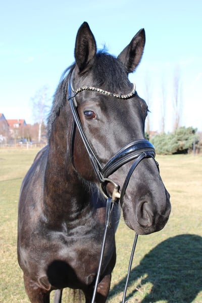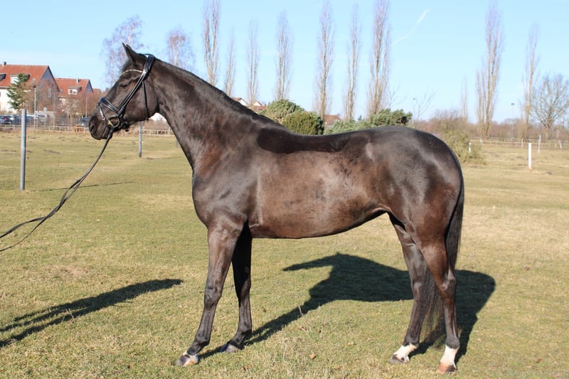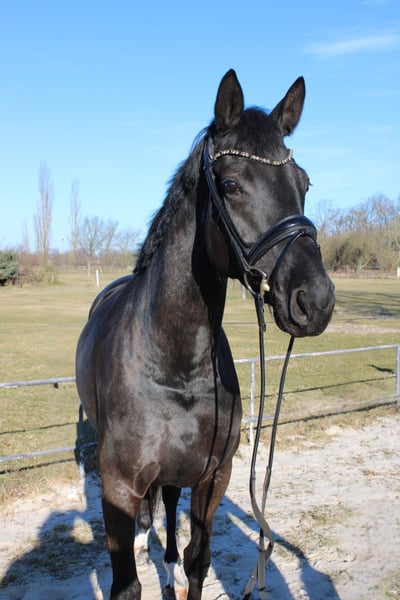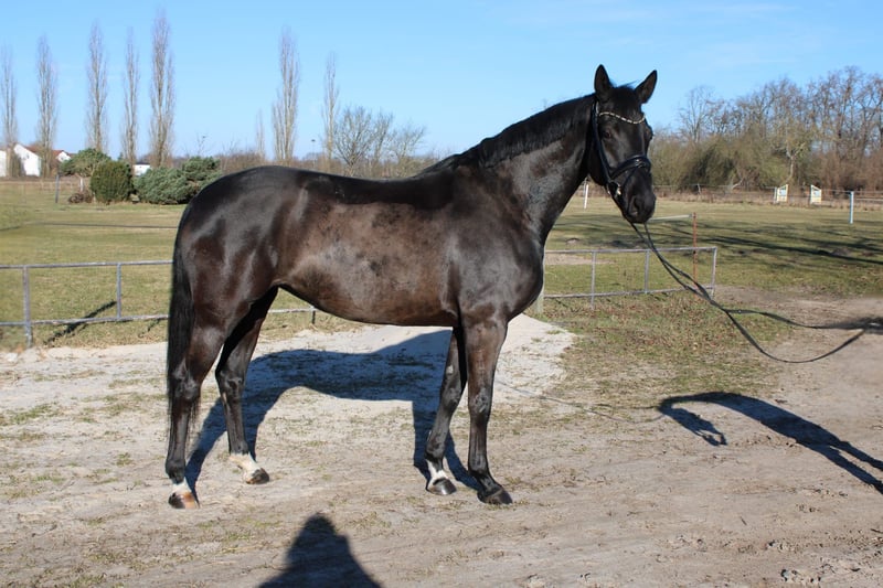 Elegant Hanoverian mare for sale – perfect for dressage! This beautiful dark mare was foaled in 2021 at Klostergut and impresses with her striking appearance and promising potential. Standing at 16.1 hh, she offers an ideal size for ambitious riders looking to progress in dressage. She has a strong character, is eager to learn, and possesses an excellent basic training. Her elegant appearance and pleasant temperament make her an ideal partner for the dedicated dressage rider. Please feel free to contact me for more information or to arrange a viewing.