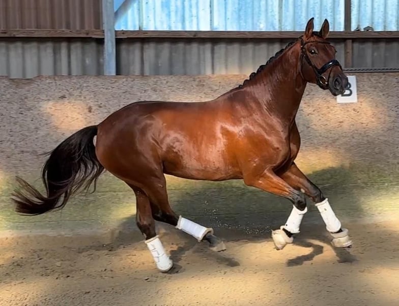 Elegant Hanoverian mare for sale – ideal for dressage We are offering a beautiful dark brown Hanoverian mare, born in 2020. Standing at 16.1 hh, she combines impressive size with a graceful appearance. She is well-suited for dressage and demonstrates great talent and a willingness to learn. This charming mare impresses with her excellent pedigree, her pleasant temperament, and her versatile potential. She is healthy, raised in a herd environment, and is in good condition. Please feel free to contact me for more information or if you are interested. Viewing and test rides are available by appointment.