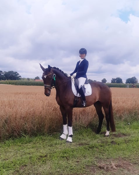 Typy, large-framed, athletic, and lovable mare with a great character and temperament. Her nerve strength and rideability have also been proven at competitions. Frida is at a secure level of Dressage Horse A and has already placed in her second test of Drpf. Kl. A. She is being trained according to the training scale. Whether you are looking for a future competition partner or a loyal leisure horse – this mare will impress you! For inquiries or more information, please contact me. Viewings and test rides are possible at any time by appointment. Tel. 0170 743 2503. Directly from the breeder.