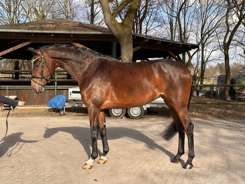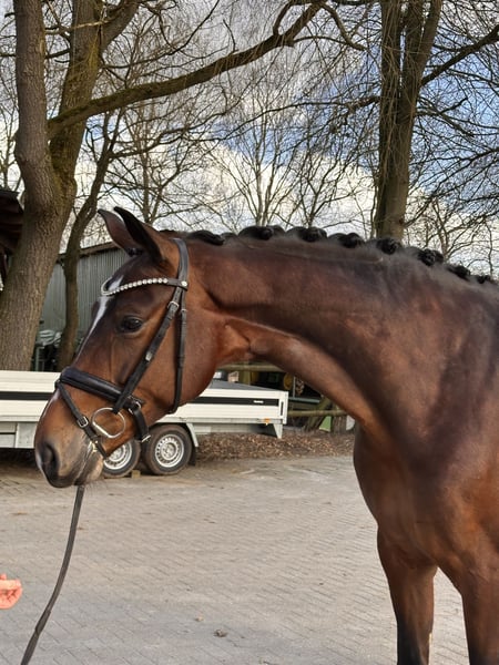 For sale is this beautiful, long-legged 5-year-old mare by Vivino out of a Sandro Hit/Fabriano dam. This tall, expressive young dressage horse impresses not only with its above-average gaits but also with a high level of willingness to perform and excellent lightness in movement. Standing at 1.74 meters, she is suitable for larger riders as well as for ladies' riding horses. The mare is also very interesting for breeding, thanks to her sport-proven dam line. Several Hannoveraner champions and BuCha finalists have descended from her dam. She is available for viewing and trial riding at any time! If you're interested or have any questions, please feel free to contact me!