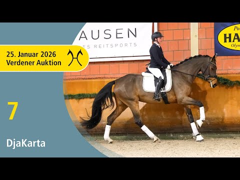 DjaKarta besticht durch auffällige Bewegungsmechanik und Ausdrucksstärke. Sie ist ein Hoffnungsträger dieser Kollektion, gezogen vom Bundeschampion und Finalisten der Weltmeisterschaften der jungen Dressurpferde, Damaschino I. Ihr sportlich erfolgreicher Mutterstamm brachte zahlreiche Dressur- und Springpferde hervor, darunter Dauphin v. De Chirico (DRE: Grand Prix mit Tabea Fröschl) und Caretina de Joter v. Caretino (SPR: international 1,60 m mit Pius Schwizer). 1. Generation Bes. Prämientöchter: VbPr Ella/Ella Maxima v. Escolar (FOA Zuchtstuten: 50.000€). 3. Generation Aufbauprüfungen Springen: Came from Holstein v. Caretino (SPR: L). 4. Generation Sportpferde Dressur: Dauphin de Bavière/Dauphin 31 v. De Chirico (DRE: Grand Prix mit Tabea Fröschle,Dressurprüfung Kl. S*** - Grand Prix de Dressage 2023); Luitschi v. Linaro (DRE: S* mit Petra Gottschalk). Sportpferde Springen: Rahmannshof Choose Me v. Cassini I (SPR: int. 1,45 m mit Ina Bormann,Springprüfung Kl. S -Großer Preis**- 145cm -international- 2019); Daisy v. Connor (SPR: 1,45 m mit Emma Stoker); Calvaro 54 v. Cassini I (SPR: 1,40 m mit Angelique Rüsen); BezPr W-Coriana/W. Coriana v. Caretino (SPR: 1,50 m mit Giovanna SOBÂNIA); gek. Hengst Conte Cassini v. Cassini I (SPR: 1,45 m mit Günter Treiber,München-Riem 2013); v. Caretino (SPR: 1,45 m mit Gilles Thomas); Spartina v. Spartacus (SPR: 1,40 m mit Marten Witt); Lacoriana v. Lasino (SPR: 1,40 m mit Sarka Schmaus); Cayenne 79 v. Contender (SPR: 1,40 m mit Laura Jane Hackbarth); v. Cosmeo (SPR: 1,35 m mit Torben Frandsen); Cedex v. Caretino (SPR: 1,35 m mit Takashi Haase); Coburger 2 v. Caretino (SPR: 1,35 m mit Stefan Daurer); Calistro 30 v. Casillas (SPR: 1,30 m mit Hannah Sophie Hinze); Livento 3 v. Livello (SPR: 1,30 m mit Natalie Leibovitz); Cappuccino to go v. Cassini Gold (SPR: 1,30 m mit Tyra Gottschalk); Campino G 3 v. Cassini Gold (SPR: 1,30 m mit Tyra Gottschalk); Quam Quam v. Quidams Rubin (SPR: 1,30 m mit Vanessa Donhauser); Quebeck 6 v. Quidam de Revel (SPR: 1,30 m mit Caroline Zimmer); v. Cassini I (SPR: 1,30 m mit Rodrigo Giesteira Almeida); Lobo 52 v. Linaro (SPR: M mit Jürgen Brautmeier); BezPr Mauriel v. Corofino I (SPR: M mit Nagel,Björn). Aufbauprüfungen Springen: BezPr T-Chablis/Chablis 133 v. Caretino (SPR: 1,30 m mit Ines Sieveke); BezPr Selena/Selena 12 v. Corrado I (SPR: M mit Karl-Heinz Markus); Queeny 116 v. Quibery (SPR: L); Lovely Girl 29 v. La Calidad (SPR: L); VbPr Strawberry Kiss/Strawberry Kiss 4 v. Companiero (SPR: L); Catino 6 v. Cassus (SPR: L); Carlos Primero 13 v. Caretino (SPR: L); Campbell 6 v. Caretino (SPR: L). gekörte Hengste: gek. Hengst Coriando v. Coriano (Neumünster 1998). Auktionspferde: v. Silvaner DC v. Silvaner DC (VA 2020). 5. Generation Sportpferde Springen: Caretina de Joter v. Caretino (SPR: int. 1,60 m mit Pius Schwizer,Grand Prix Two Rounds 2016,Grand Prix Two Rounds 2016,Grand Prix Table A 2016,Grand Prix Two Rounds 2016,Grand Prix Two Rounds 2016,Grand Prix Table A 2016,Grand Prix Two Rounds 2016,Grand Prix Two Rounds 2016,Grand Prix Two Rounds 2016,Grand Prix Two Rounds 2015,Grand Prix Two Rounds 2015,Grand Prix Two Rounds 2015,Grand Prix Table A 2015,Springprüfung Kl. S -Großer Preis*****- -international- 2015,Grand Prix Two Rounds 2015,Grand Prix Table A 2015,Springprüfung Kl. S -Großer Preis**- 145cm -international- 2013); Latino 125 v. Lasino (SPR: int. 1,50 m mit Tjark Nagel); Call me FCommander v. Casall (SPR: 1,45 m mit Josefine Sandgaard Morup); Cambito v. Caretino (SPR: 1,55 m mit Paige JOHNSON,Grand Prix Table A 2014); gek. Hengst Cassini Gold v. Cassini I (SPR: 1,50 m mit Julio David VAINER,Elmshorn 2011); Quintoni v. Quidam de Revel (SPR: 1,40 m mit Gianna Molly); Dominator 21 v. Diamant De Semilly (SPR: 1,40 m mit Miguel VIANA); Canto de Caretina v. Canto (SPR: 1,40 m mit Linda Naeve-Haht); Landego 13 v. Lago Maggiore (SPR: S mit Halle,Jan ter); v. Caretino Gold (SPR: 1,30 m mit Enola Mulder); Appolo 39 v. Athlet Z (SPR: M mit Groth,Sascha). Aufbauprüfungen Springen: Casanova 525 v. Casall (SPR: 1,30 m mit Nikolaus Leckebusch-Peters); Crumble Cake v. Crumble (SPR: L); Chinomi v. Chin Champ (SPR: L); gek. Hengst Queens King v. Quidam de Revel (SPR: L,München-Riem 2012); Latino G v. Lasino (SPR: L); Condor 526 v. Contender (SPR: L); BezPr Leonie II/Leonie 49 v. Corofino I (SPR: L). Mutter: Nahla ZL: 5/4 Großmutter: Came from Holstein ZL: 9/4 ZSP: Feldprüfung Reitpferd - Trab 7,50 Galopp 7,50 Schritt 7,50 / Durchschnitt Rittigkeit 8,00 / Durchschnitt Springen 9,00 Turniererfolge: SPF: L 1/4. SPF: A 1/3. 1/4. 1/w. Das Pferd ist ein Verdener Auktionspferd und wird am 25.01.2026 online versteigert. Vom 12.01. bis zum 25.01. kann das Pferd jeden Tag beim öffentlichen Training besichtigt und ausprobiert werden. Das Startgebot bei der Versteigerung ist 8.000 Euro.