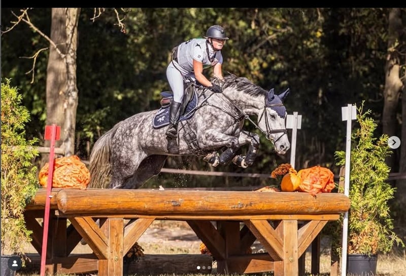Ta urocza 6-letnia klacz maści siwej zachwyca swoim przyjaznym usposobieniem, talentem i wszechstronnością zastosowań. Po urodzeniu źrebaka trafiła sześć miesięcy temu pod moją opiekę i w tym czasie nieprzerwanie i pewnie rozwijała się od poziomu E do L w konkursach terenowych. Znała podstawy, szybko przyswajała nowe umiejętności w swoim nowym otoczeniu i z dużym zaangażowaniem oraz otwartym podejściem podjęła się swoich zadań, szczególnie wykazując radość z skoków i jazdy w terenie. Warto podkreślić jej trzy atrakcyjne podstawowe chody, w szczególności obszerny, przestronny galop. Dysponuje dużymi możliwościami, siłą i odwagą w skokach, a jednocześnie pozostaje dobrze regulowana, da się pracować i pędzić, a także wybacza małe błędy mniej doświadczonym jeźdźcom – co świadczy o jej niezwykłym podejściu w tak młodym wieku. Oczywiście te cechy muszą być dalej rozwijane pod okiem profesjonalnych trenerów, a także dressura pozostaje w centrum jej szkolenia. Tutaj widać późniejsze wprowadzenie do ukierunkowanego treningu, a fizycznie potrzebowała czasu, aby uformować odpowiednią muskulaturę, znaleźć równowagę i stać się bardziej elastyczną. Stopniowo przyswaja lekcje L, co również przekłada się na poprawę jej jeździeckich umiejętności w innych dyscyplinach. Dzięki swojemu zwartemu formatowi jest przyjemna w obsłudze, ale dobrze sprawdza się także z większymi jeźdźcami. Nadaje się zarówno jako koń dla młodych jeźdźców lub juniorów, jako koń dla przesiadających się, jak i dla ambitnych amatorów. Cieszy się z jazdy w terenie, jak i z ukierunkowanych treningów. W kontaktach jest towarzyska, przytulaśna i ciekawska, a szczególnie otwarta, gdy znajdzie osobę, z którą się zwiąże. Klacz jest własnością swojego hodowcy, który towarzyszy jej od samego początku. Regularnie jest poddawana kontroli kowala i weterynarza, jest odrobaczona i zaszczepiona. Posiadamy zdjęcia rentgenowskie, klacz została oceniona przez weterynarza w Verden i otrzymała wyróżnienie Vet+.