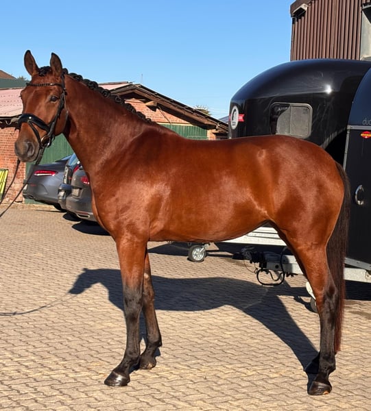 Elegant Hanoverian mare for sale – ideal for dressage We are offering a beautiful dark brown Hanoverian mare, born in 2020. Standing at 16.1 hh, she combines impressive size with a graceful appearance. She is well-suited for dressage and demonstrates great talent and a willingness to learn. This charming mare impresses with her excellent pedigree, her pleasant temperament, and her versatile potential. She is healthy, raised in a herd environment, and is in good condition. Please feel free to contact me for more information or if you are interested. Viewing and test rides are available by appointment.