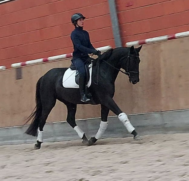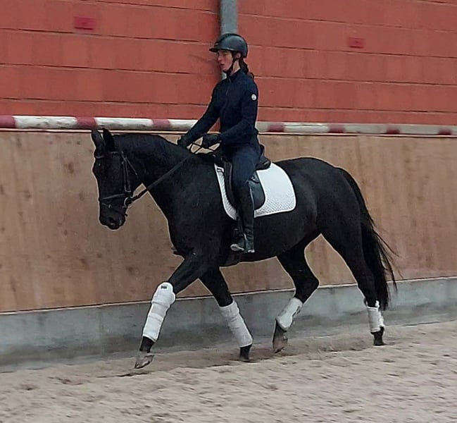 Doralie is a large-framed black mare that has been used for breeding so far. She has produced three excellent offspring with the stallions Iron, Escanto, and Seattle, who presented themselves as strong movers and of good type. She herself was backed as a three-year-old and is now being re-trained after weaning this year's foal, showing herself to be willing to learn and cooperative. From the maternal line, there are highly successful competition horses in the disciplines of dressage and eventing that have been successful with amateurs. Due to a radiological finding in a young horse that has completely healed, this mare is now being sold well below her value into appreciative hands. Currently, there is no video material available.