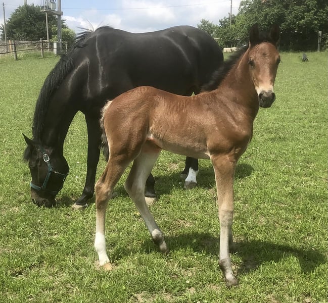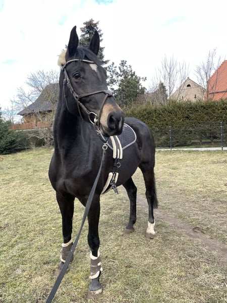 For sale is a beautiful mare from top-notch breeding. **Features:** - **Breed:** Hanoverian, registered with the Oldenburg International Show Jumping Breeding Association - **Gender:** Mare - **Year of Birth:** 2019 - **Color:** Black-brown - **Height:** 170 cm This wonderful mare impresses with her harmonious conformation, great movements, and already some promising offspring. Both through her sire Conteur and her dam's sire Aljano, she has a double talent. She moves beautifully but has been paired with show jumping stallions so far and has given us a wonderful filly by Dinken (visible in the photos). She is confirmed in foal for 2026 by Vagabond (Sosath). She has always taken on the first attempt, has had an uncomplicated pregnancy and birth, and is an exemplary mother. Due to her lineage, conformation, and temperament, she is certainly also interesting as a riding horse, but is currently still untrained due to her breeding use. If you are interested or have any further questions, please feel free to contact me.