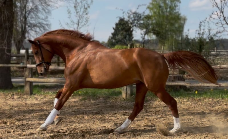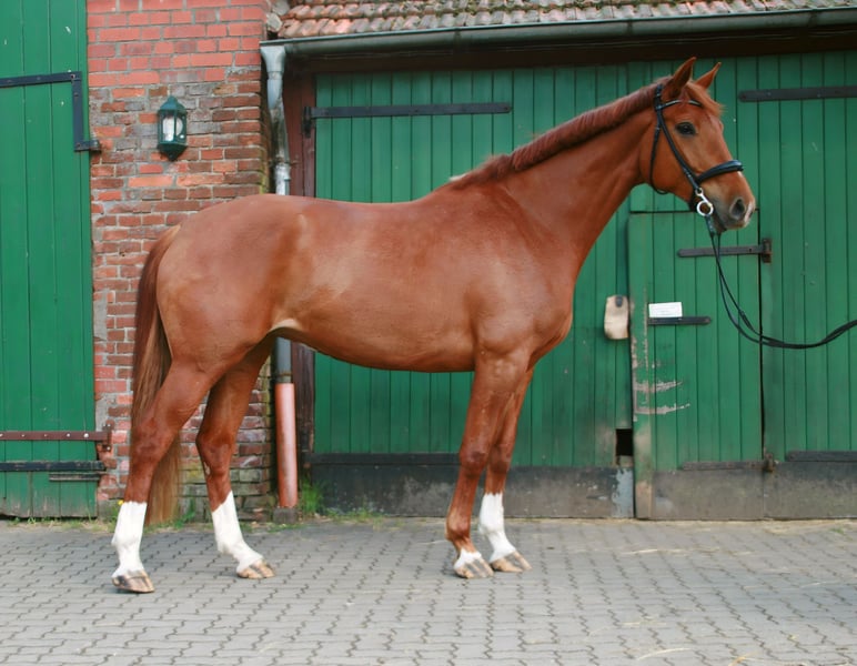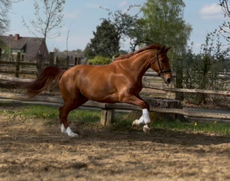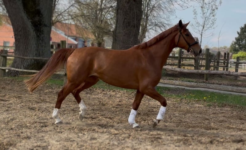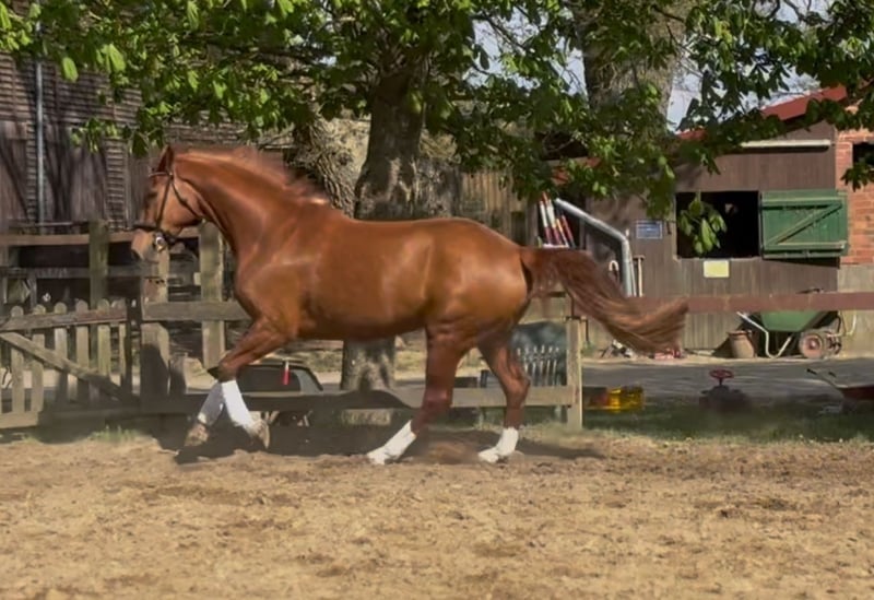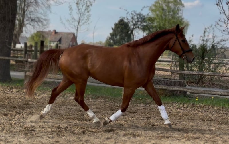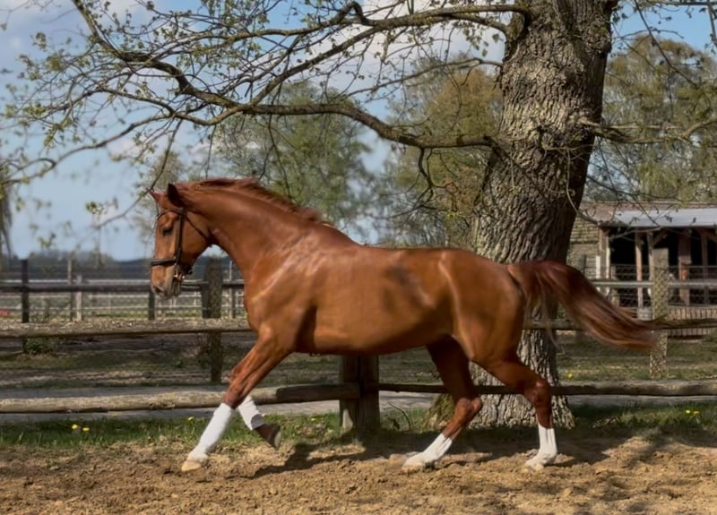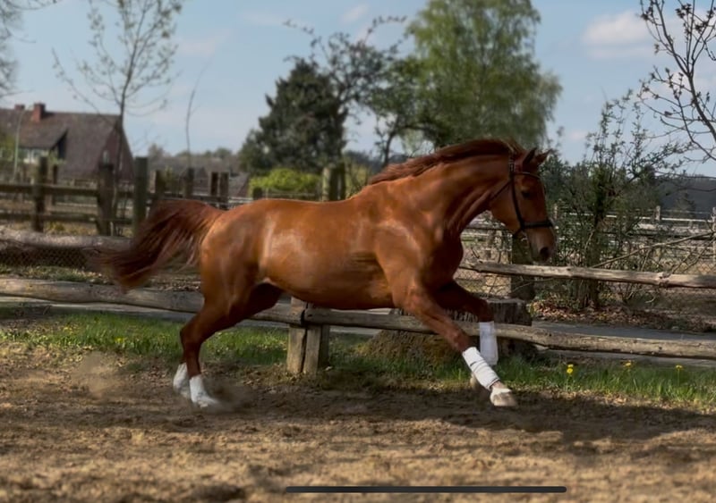 Pretty charming chestnut mare with a lot of charm and expression! 6 years old, born in 2019, 1.72 cm tall. Floriscount / Worldly - De Niro - Western Star - Grande The mare is being sold well below her value due to a finding and therefore will not be sold as a riding horse. Hence the price. This is not an urgent sale!! She could certainly do well in front of a carriage, continue with groundwork, lunging, circus lessons for horses, or be interesting for breeding. Whether she could ever be rideable, I cannot say, so I exclude this in the sale!! Very attractive, charming, lovable, and affectionate mare with spirit, presence, and that certain something is looking for a loving 5-star home. The mare was raised by me and carefully brought up with a lot of love and understanding. She has lacked nothing. She has always been well mineralized and fed, with very good roughage available at all times. From the beginning, her hooves were regularly attended to, her teeth checked and done every year, and osteopathic treatments were carried out regularly when needed. She always had plenty of turnout on large areas, could stay with her mother for a year, and was weaned with a lot of sensitivity. She is lovable to handle and can be led, groomed, and tied up by anyone. She knows and likes water and being hosed down, loves children, dogs, and cats very much, and is also easy to lead and hold in the terrain with a halter and rope. She is well acquainted with a riding saddle and lunging girth, and there are no issues with that. She is worked with regularly. The riding arena with mirrors and outdoor areas right next to a busy road is also no problem. She is road-safe (tractors, trucks, motorcycles, cars with trailers) – all no problem. Farrier, veterinarian, and trailer loading are also no problem. She is familiar with groundwork, desensitization training, double lunging, jumping work on the lunge, or free jumping and does everything well. She is very intelligent, sensitive, and learns incredibly quickly. She wants to please and enjoys working with people. She is never stubborn or unwilling. She is always curious and open to new experiences. She is familiar with box stalls, paddocks, open stable housing, and 24-hour turnout in a mixed herd – all no problem. No eczema, no dust allergy, no cough, and she tolerates various horse feeds well. She has a very good pedigree and excellent gaits. Equipment can be purchased if desired. Bridle and Micklem, a fitted almost new dressage Passier saddle, sheepskin girth, saddle pad, boots, bell boots, and matching blankets (cooler, rain blanket, thicker outdoor blanket) can be purchased additionally. I wish for the mare, if possible, a permanent home, as she is very dear to me, and I will only give her into truly verifiably good hands with a protection contract. The mare will not be sold to dealers!! Only serious inquiries will be processed. The mare is located in a riding stable and can be presented at any time for serious interested parties. Home before price!