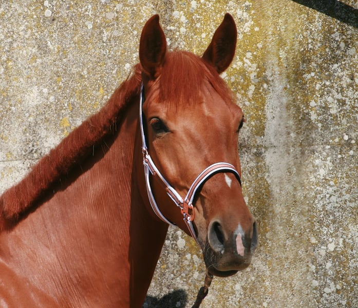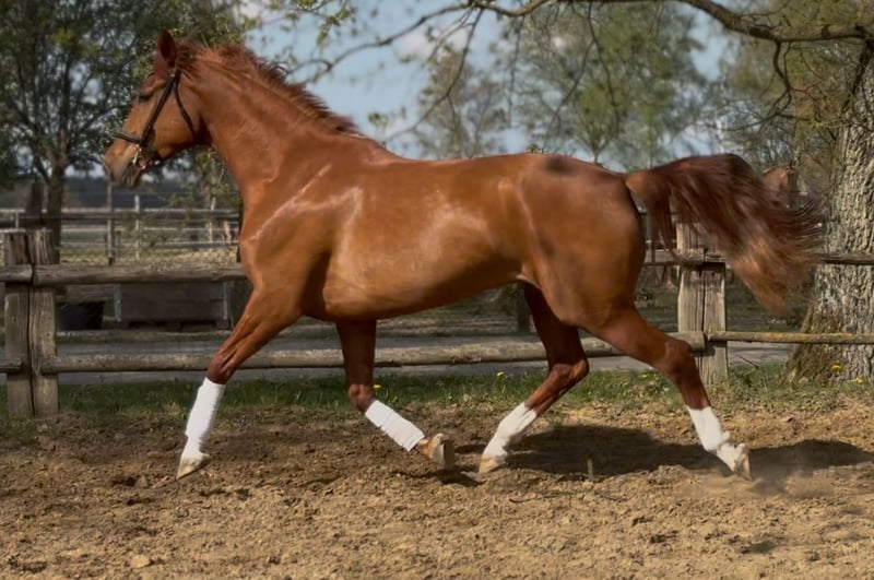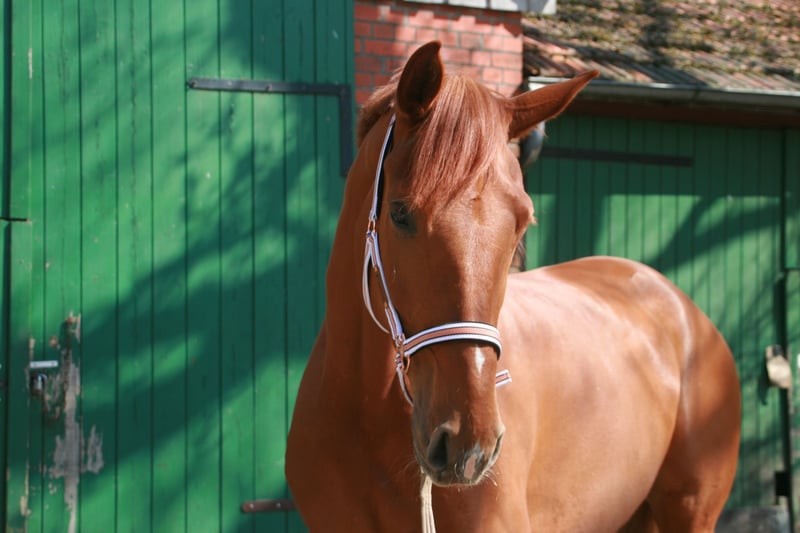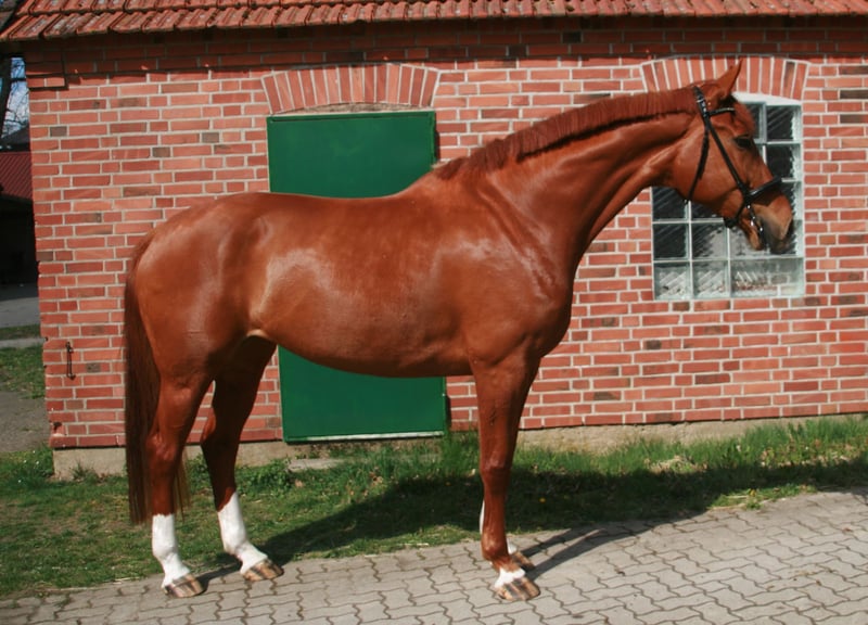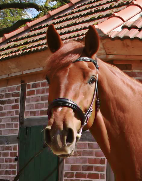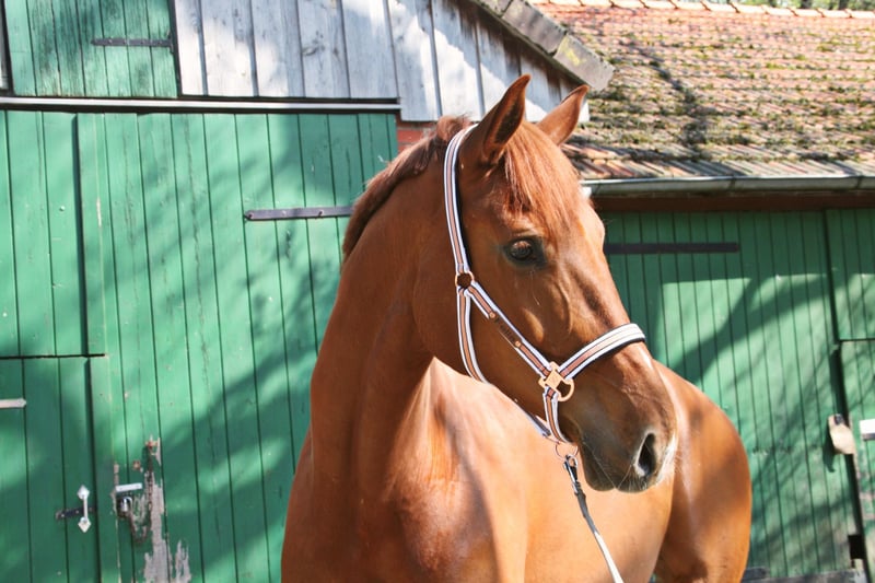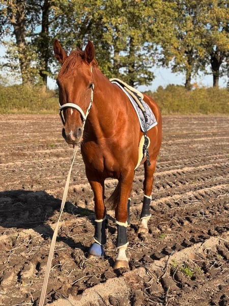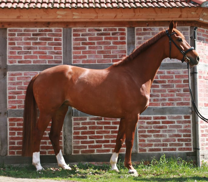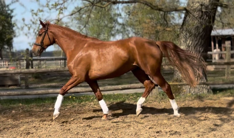 Pretty charming chestnut mare with a lot of charm and expression! 6 years old, born in 2019, 1.72 cm tall. Floriscount / Worldly - De Niro - Western Star - Grande The mare is being sold well below her value due to a finding and therefore will not be sold as a riding horse. Hence the price. This is not an urgent sale!! She could certainly do well in front of a carriage, continue with groundwork, lunging, circus lessons for horses, or be interesting for breeding. Whether she could ever be rideable, I cannot say, so I exclude this in the sale!! Very attractive, charming, lovable, and affectionate mare with spirit, presence, and that certain something is looking for a loving 5-star home. The mare was raised by me and carefully brought up with a lot of love and understanding. She has lacked nothing. She has always been well mineralized and fed, with very good roughage available at all times. From the beginning, her hooves were regularly attended to, her teeth checked and done every year, and osteopathic treatments were carried out regularly when needed. She always had plenty of turnout on large areas, could stay with her mother for a year, and was weaned with a lot of sensitivity. She is lovable to handle and can be led, groomed, and tied up by anyone. She knows and likes water and being hosed down, loves children, dogs, and cats very much, and is also easy to lead and hold in the terrain with a halter and rope. She is well acquainted with a riding saddle and lunging girth, and there are no issues with that. She is worked with regularly. The riding arena with mirrors and outdoor areas right next to a busy road is also no problem. She is road-safe (tractors, trucks, motorcycles, cars with trailers) – all no problem. Farrier, veterinarian, and trailer loading are also no problem. She is familiar with groundwork, desensitization training, double lunging, jumping work on the lunge, or free jumping and does everything well. She is very intelligent, sensitive, and learns incredibly quickly. She wants to please and enjoys working with people. She is never stubborn or unwilling. She is always curious and open to new experiences. She is familiar with box stalls, paddocks, open stable housing, and 24-hour turnout in a mixed herd – all no problem. No eczema, no dust allergy, no cough, and she tolerates various horse feeds well. She has a very good pedigree and excellent gaits. Equipment can be purchased if desired. Bridle and Micklem, a fitted almost new dressage Passier saddle, sheepskin girth, saddle pad, boots, bell boots, and matching blankets (cooler, rain blanket, thicker outdoor blanket) can be purchased additionally. I wish for the mare, if possible, a permanent home, as she is very dear to me, and I will only give her into truly verifiably good hands with a protection contract. The mare will not be sold to dealers!! Only serious inquiries will be processed. The mare is located in a riding stable and can be presented at any time for serious interested parties. Home before price!